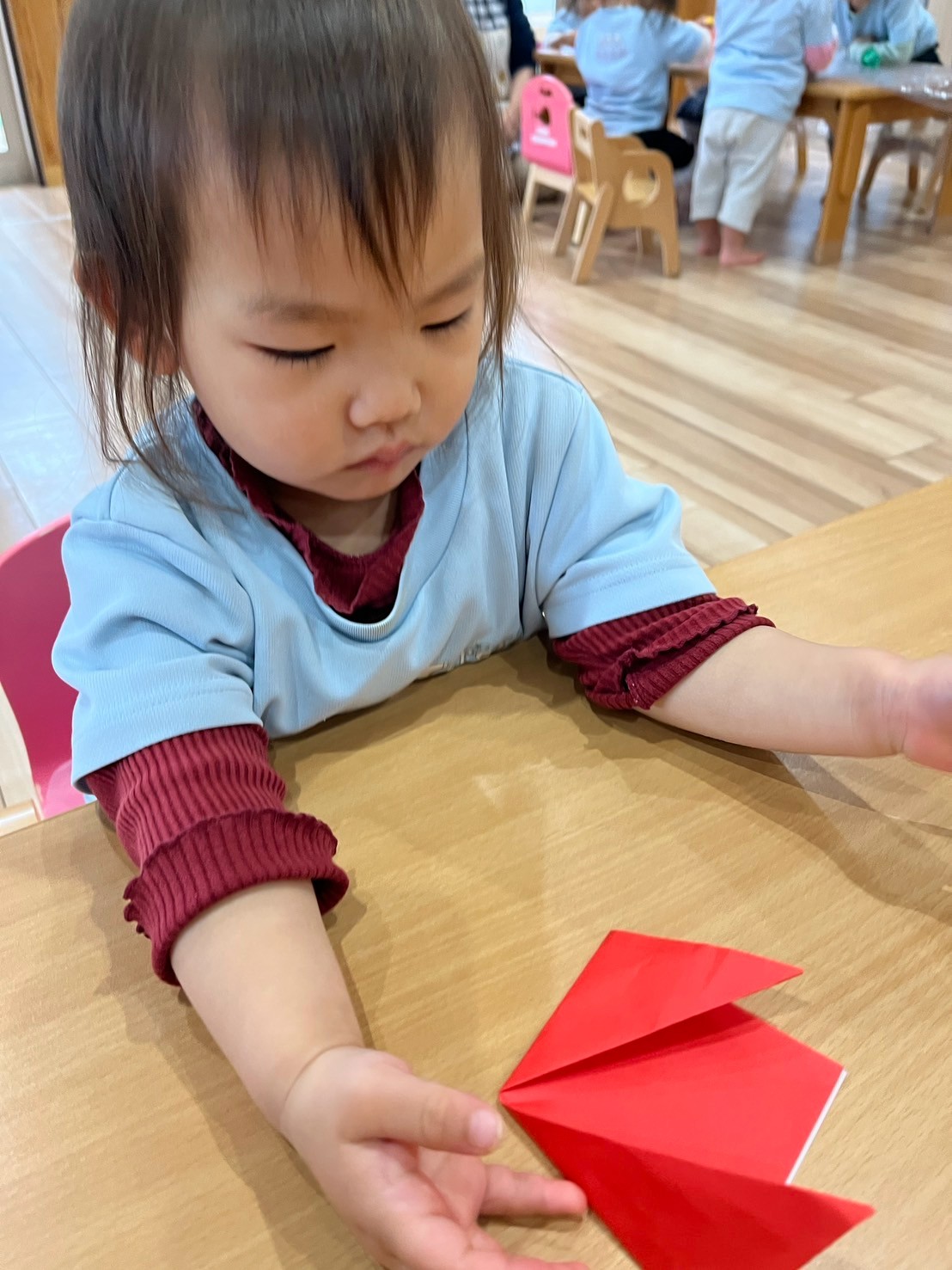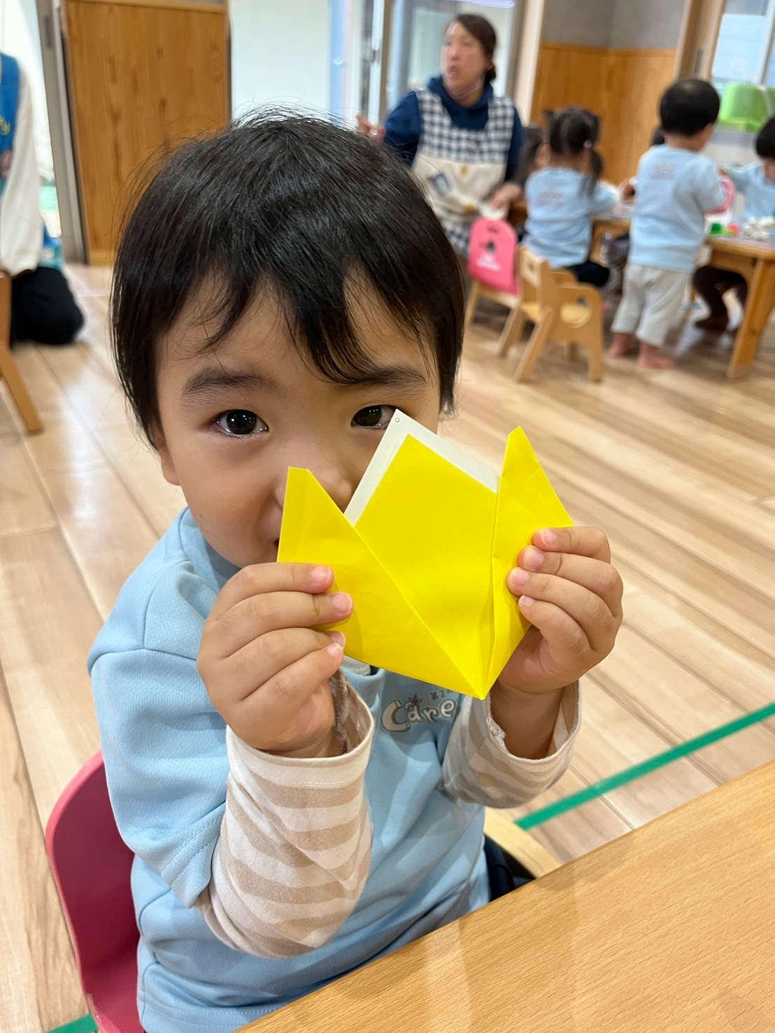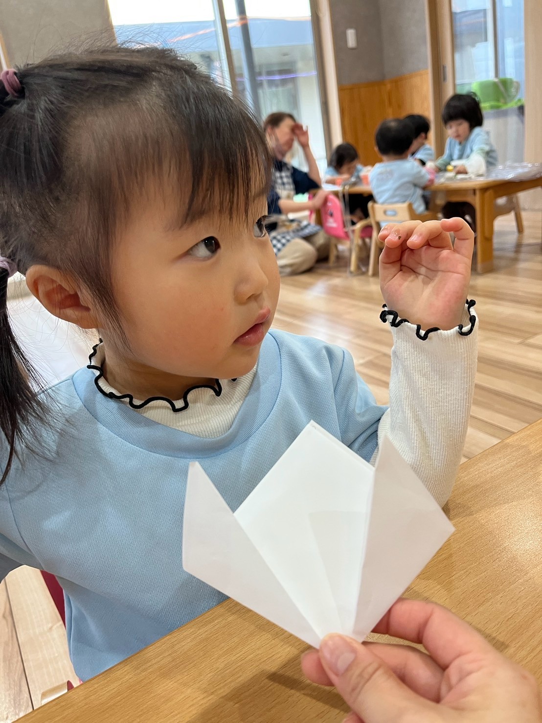 折り紙を使って基本の三角や四角折もしましたよ🎶前回折り紙を折った時に比べて角を合わせるのが上手になっていました🥹最後はチューリップを保育者と一緒に折って持ち帰ってます🌷