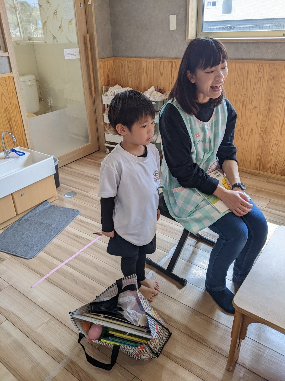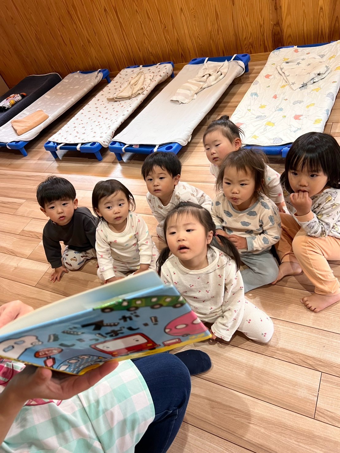 バスの絵本の読み聞かせでは、「あか!!」「むらさき!!」と色にも興味津々で