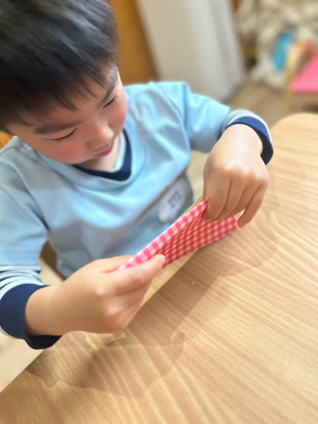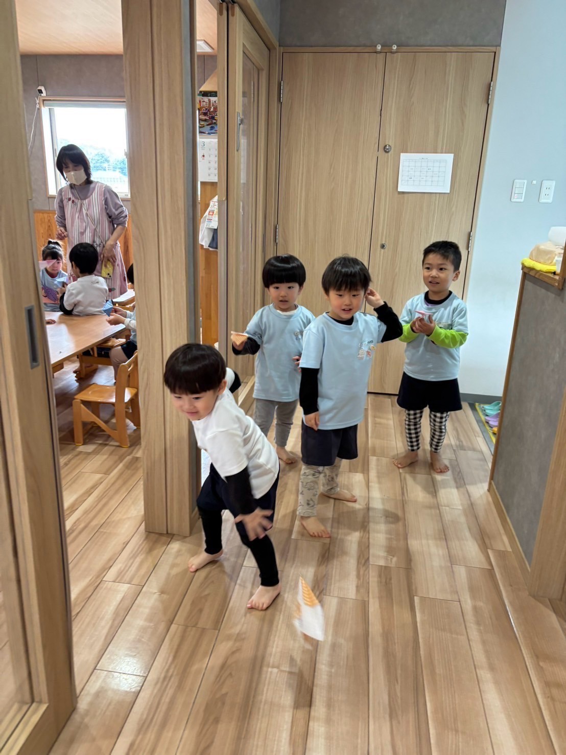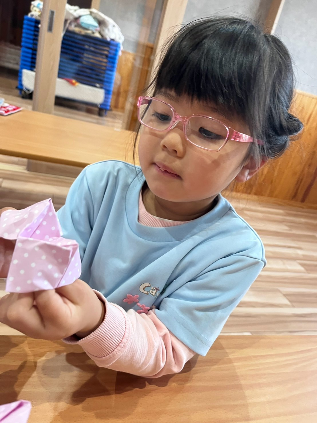 ぱんだうさぎ組は保育者と一緒に折り紙遊びをして、紙飛行機やパックンチョを作りましたよ😆折り紙に好きに絵を描いた子もいました🖍️💕