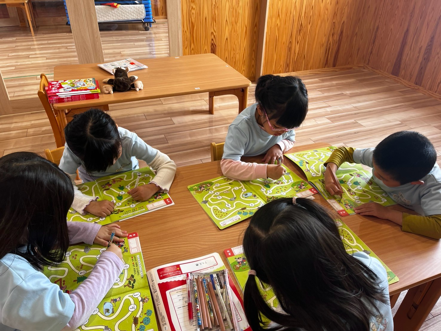こあら組はポピーをしました✏️もじを読んで間違いを探したり、かずを数えてシールを貼ったりしました✨みんなのリクエストで最後はめいろもしました☺️折り紙遊びもして保育者と一緒にパックンチョを折りましたよ🫶🏻