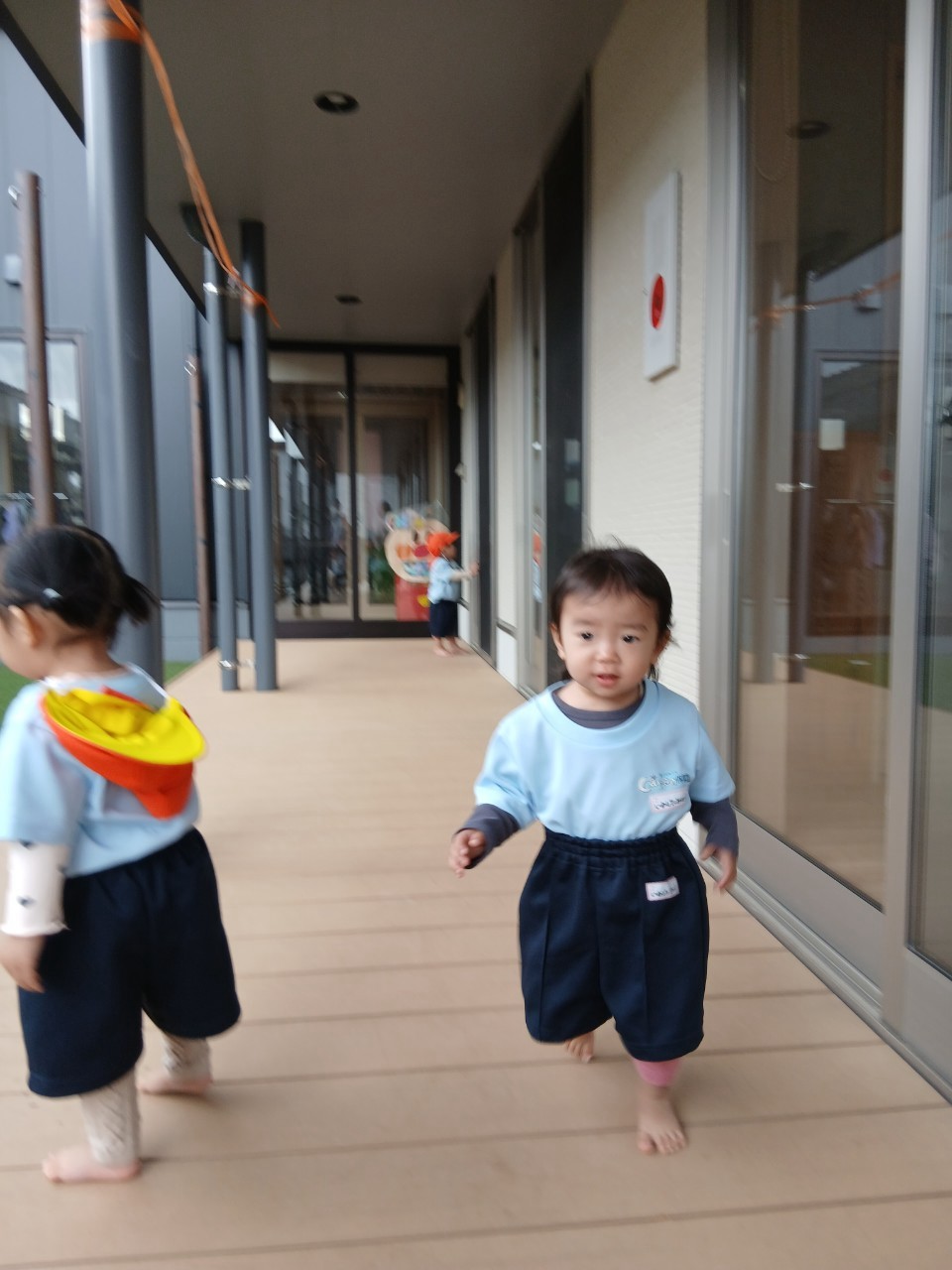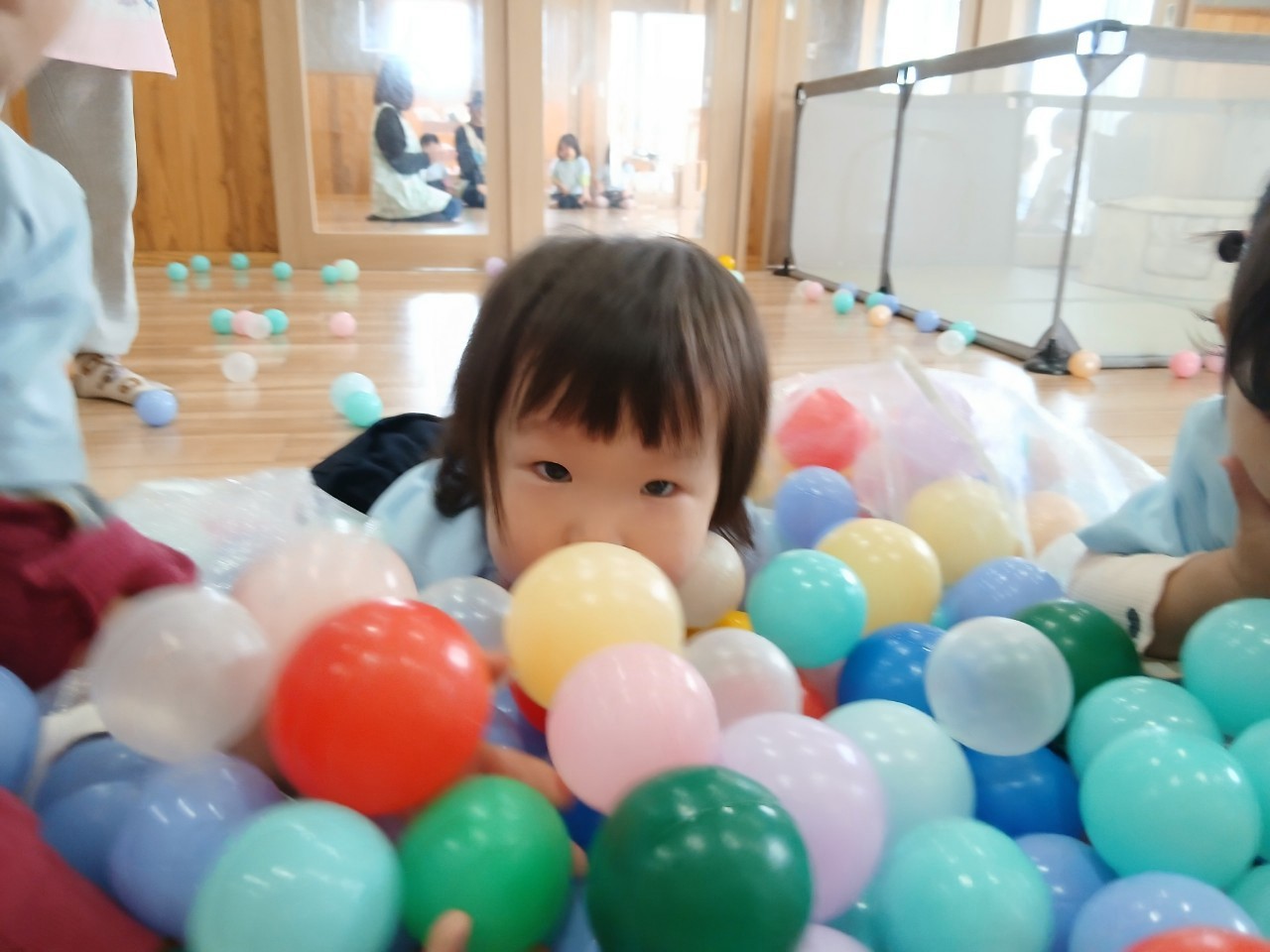 お外で遊ぼうと元気に飛び出しましたが、パラパラと雨が降って来て☔️テラスに雨粒が落ちて点々と水玉になっていたのを眺めたり、テラスを走ってみたり😄お外で遊びたかった気持ちを切り替えて、お部屋に入って、アンパンマンのボールプールで遊びましたよ❣️