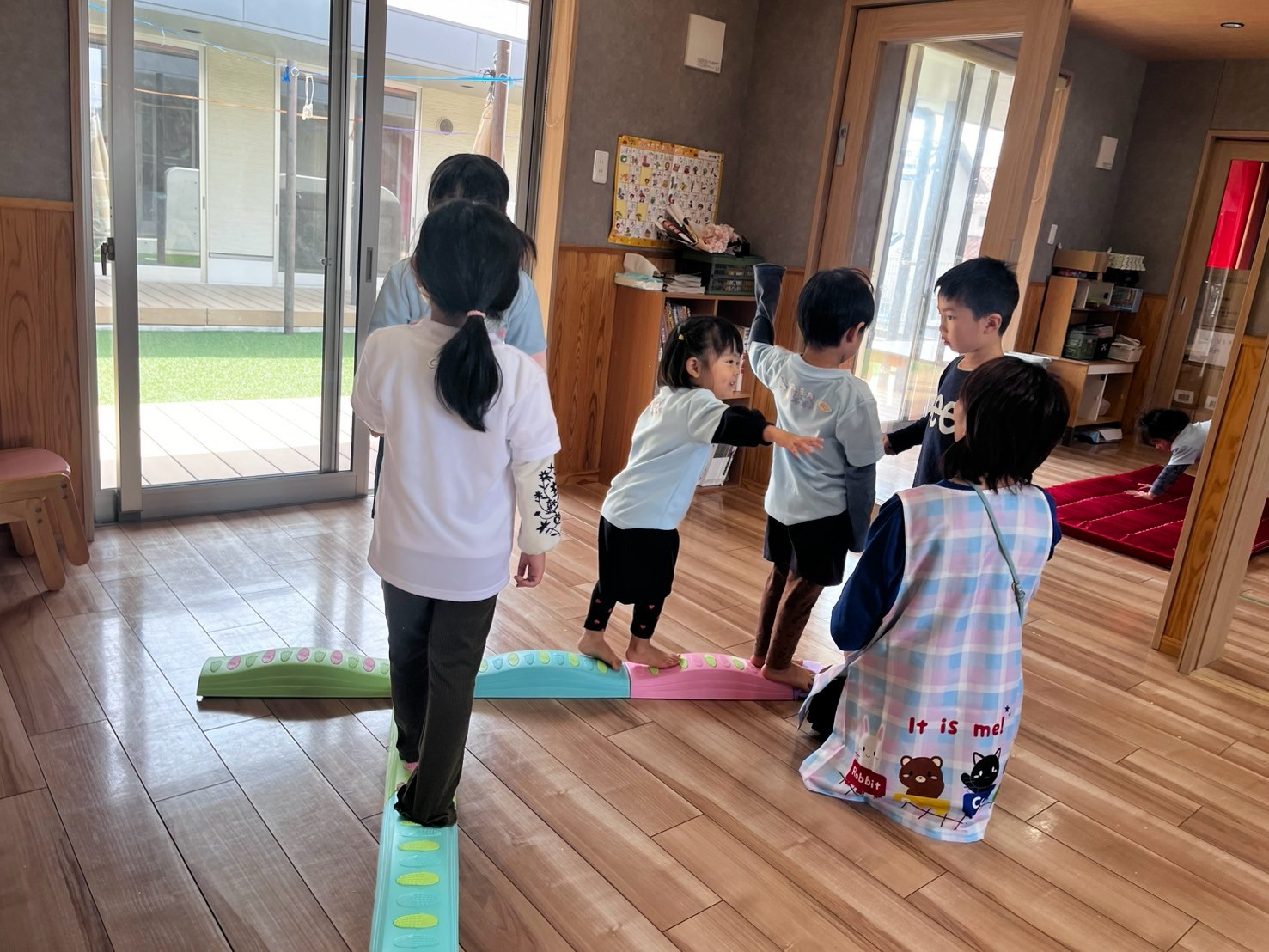 そのあとは室内で運動遊びをしました!滑り台、トランポリン、マットや平均台を使って順番を守りながら楽しく遊びました🥹❤️【くりえいと園の今日の給食です】