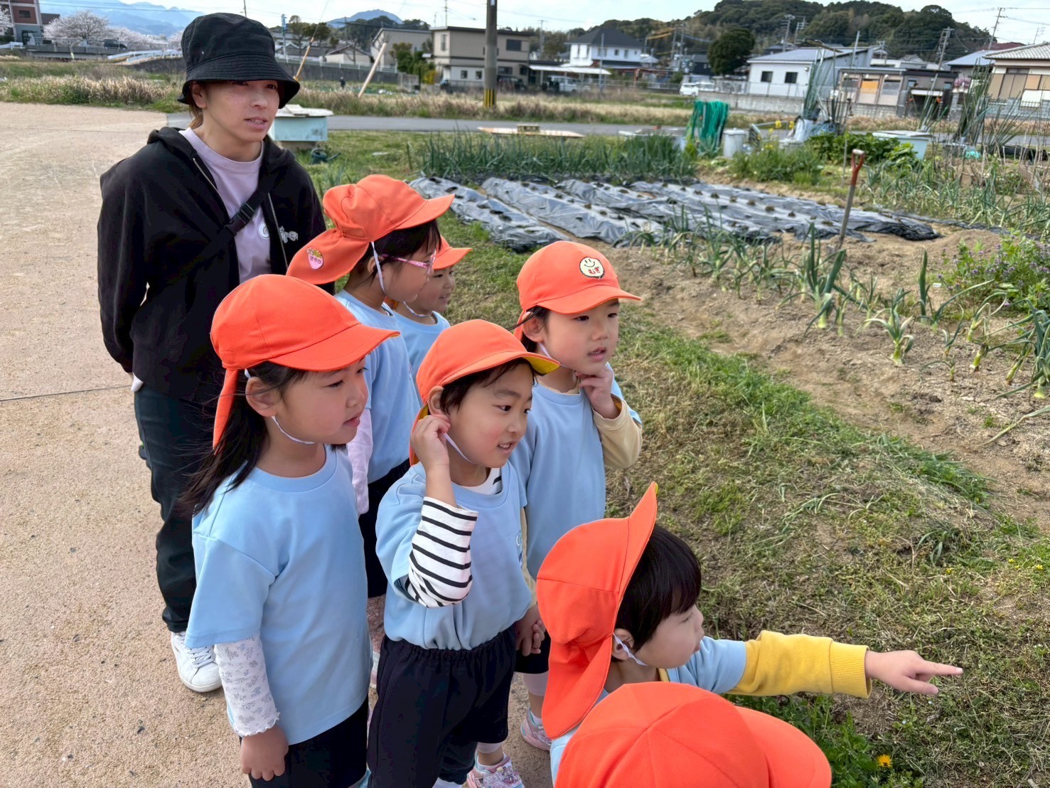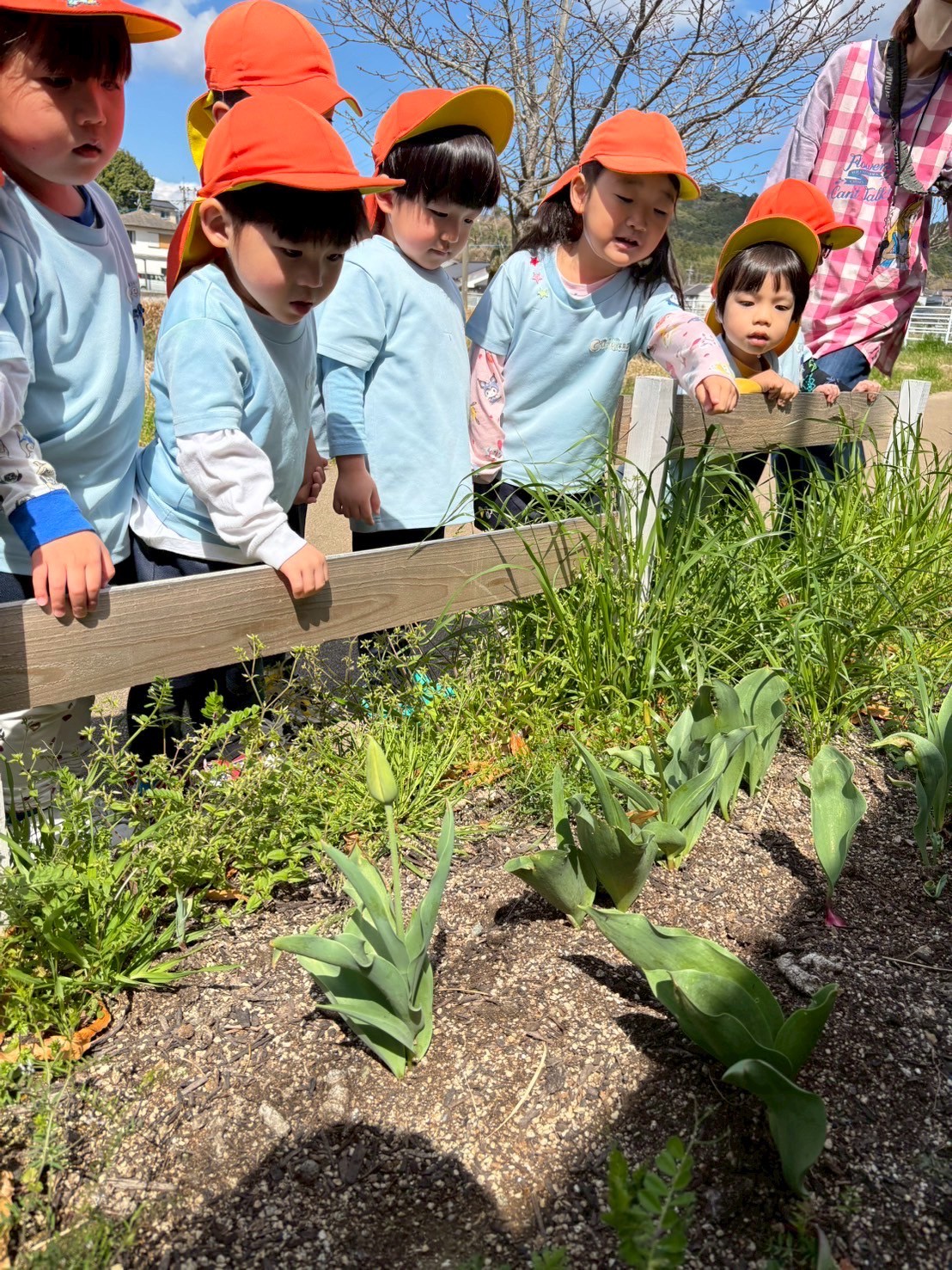朝はみんなで「だるま気分でロケンロー」の体操をしました🤸‍♀️今日は以上児でてくてくロードの周りを散歩しました🌞うさぎ組とこあら組でペアを作って列や前後を意識しながら歩く練習をしました👣歩きながらカレンの花壇に咲いているチューリップの観察をしたり畑に植えてある野菜を保育者がクイズにして全員で会話をしながら歩きました😚途中、水分補給もした後保育園に戻り、園庭でボールや保育者が飛ばすシャボン玉を追いかけて遊ぶ時間もつくりました⚽️天気も気候も良かったのでとても気持ちの良い散歩でした🌸