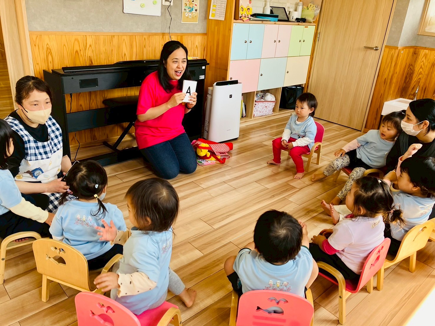 名前を呼んでもらって、お返事をしたり、英語の歌を一緒に歌っているうちに