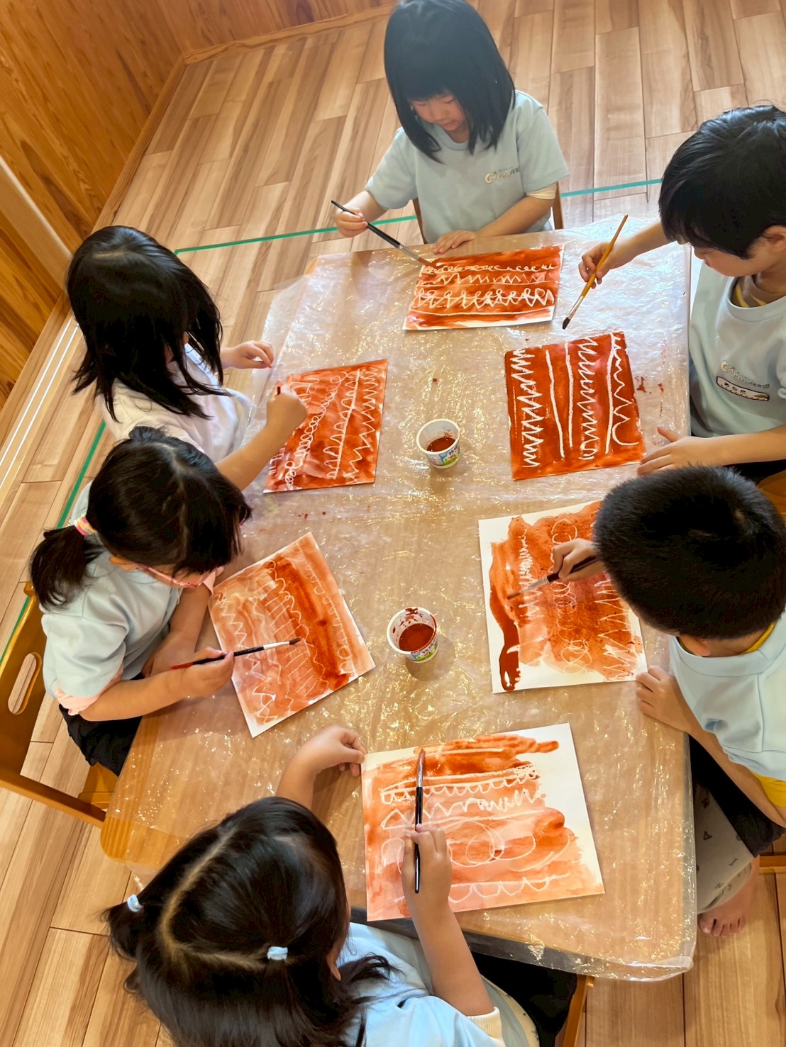 クレヨンで模様を書いた後に絵の具でいろをつけると、綺麗に弾く様子を嬉しそうに見ていました🫶