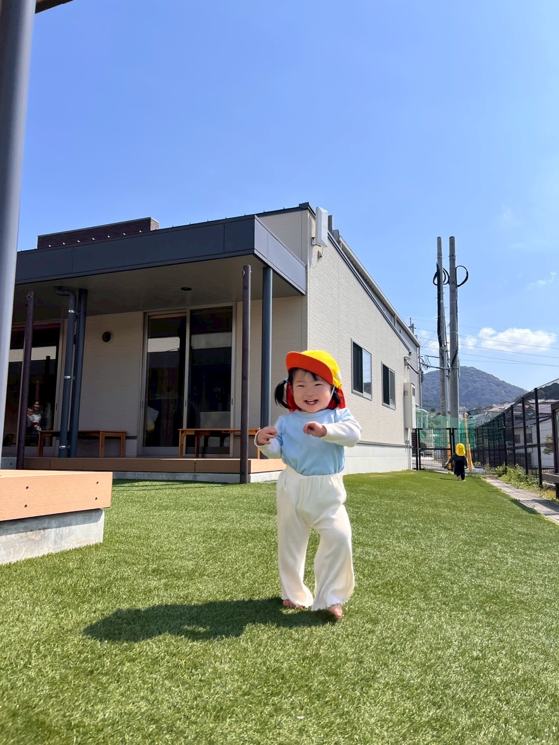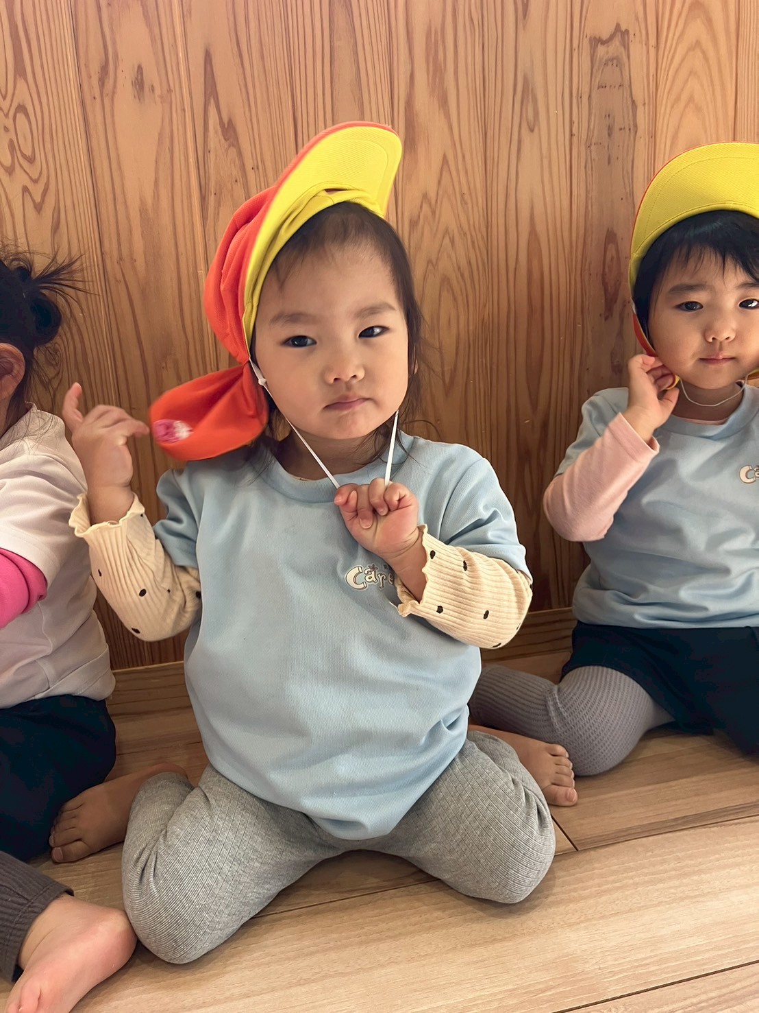 その後は自分で帽子をかぶる練習をして、一人ずつ「グッモーニング!!」と真似して言ってからお外へ行きました😁