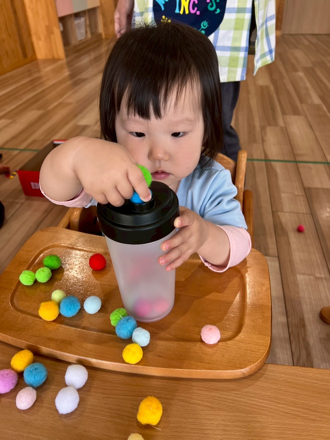 ストローやキャップ、ぽんぽんを小さい穴の中に入れるポットン落としですが指先を上手に使い入れることが出来ていましたよ🥰👏