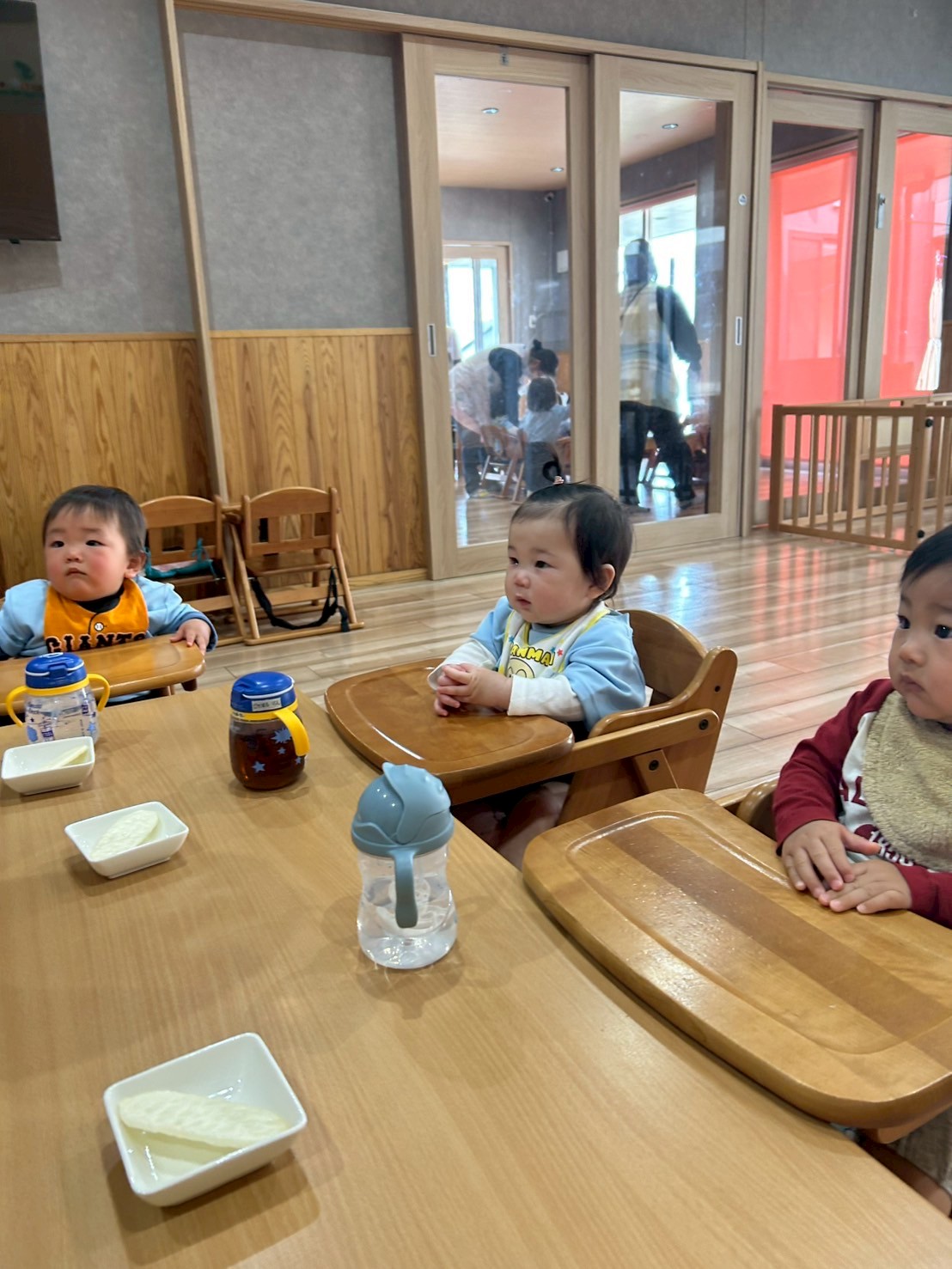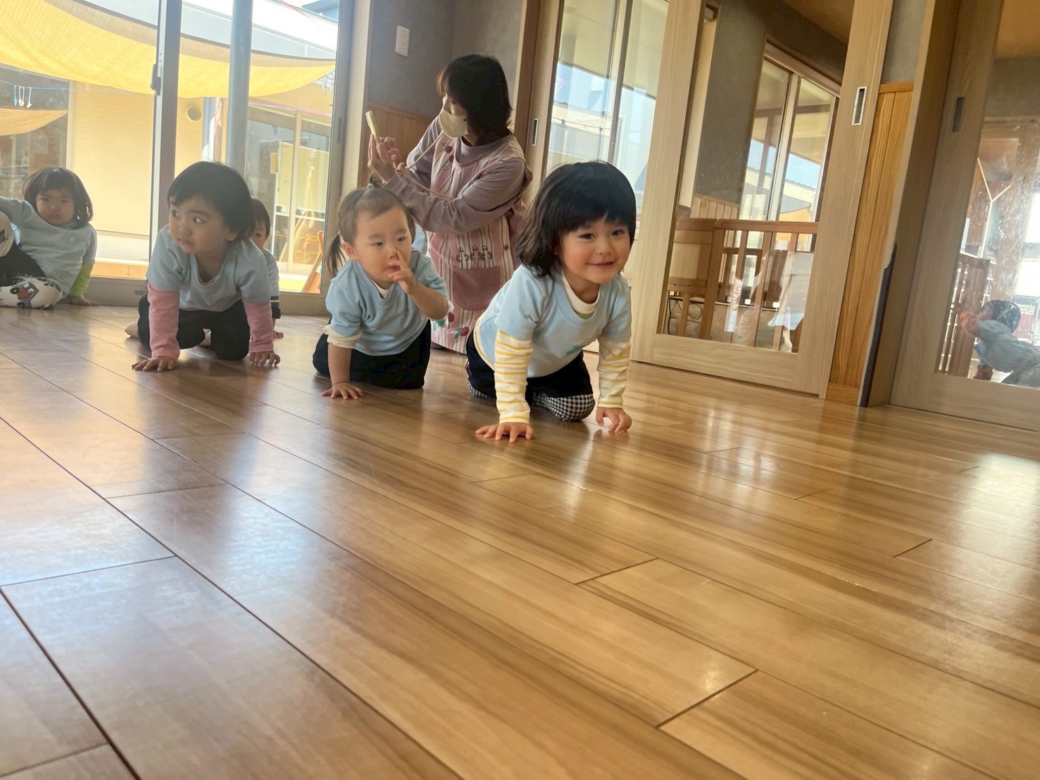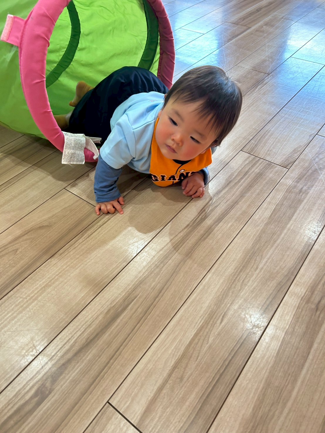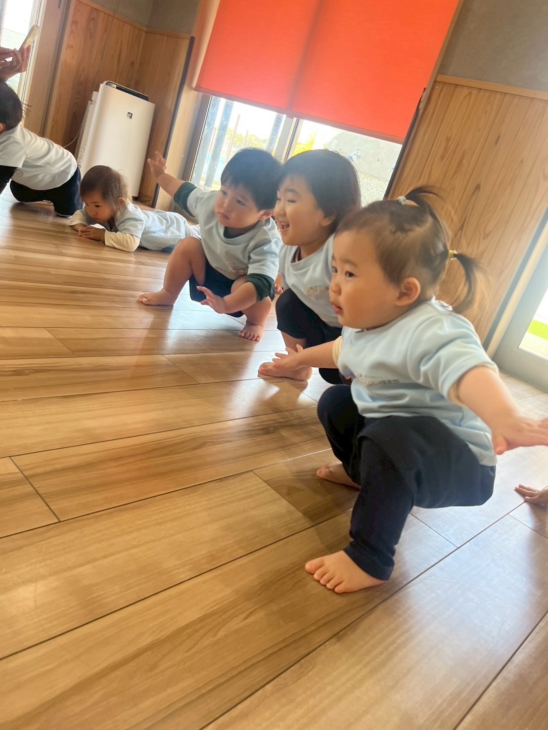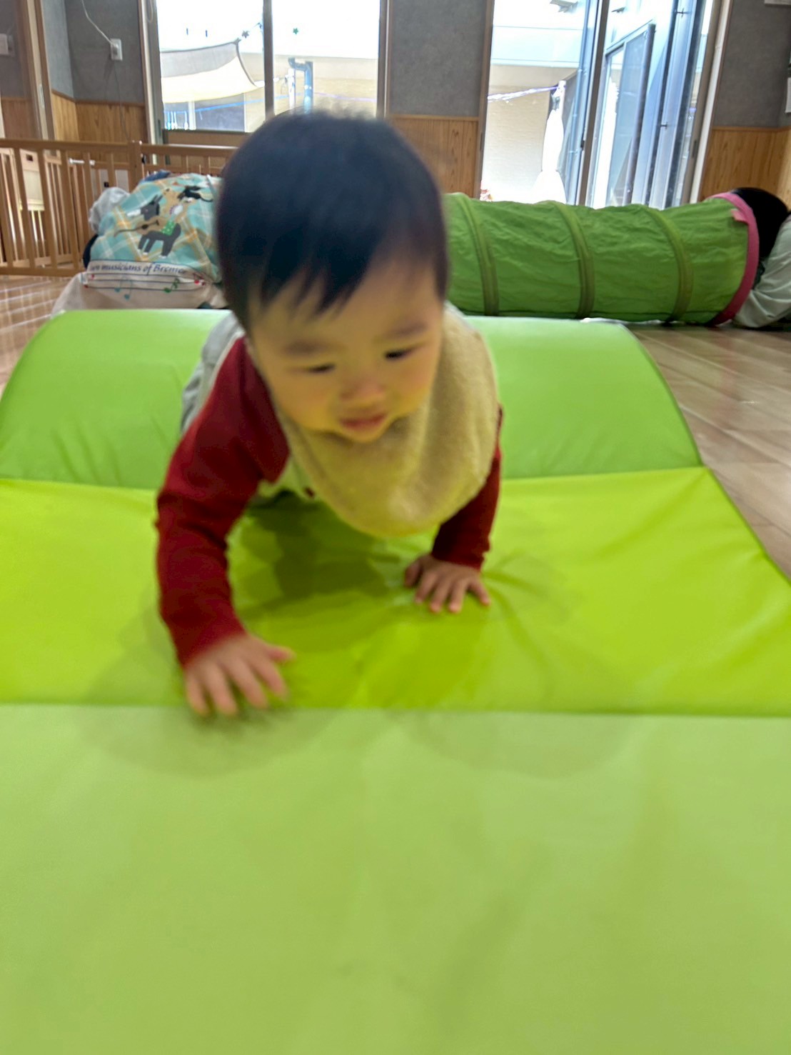初めはマットで作ったお山や長いトンネルにびくびくしながら様子を見ていた子たちも次第にトンネルをくぐってみたり、山をハイハイで登り降りしたりと体全身を使って楽しく遊ぶ事ができました☺️途中からはウトウトと寝てしまう子と園庭組と分かれてました(眠い)