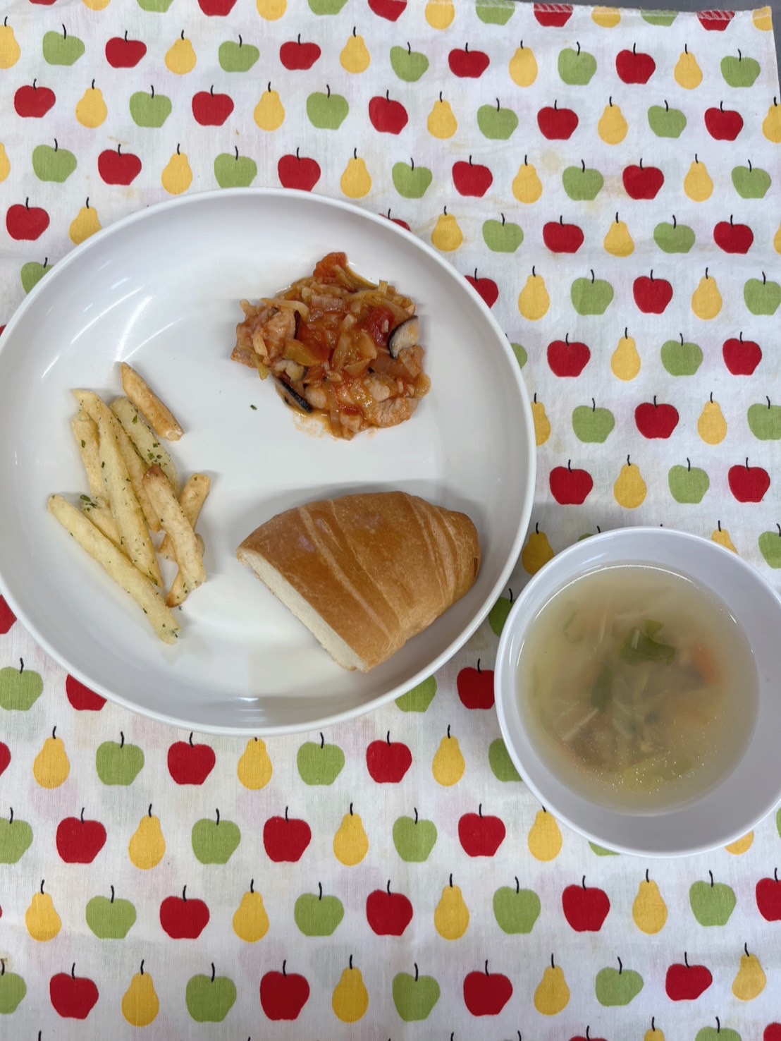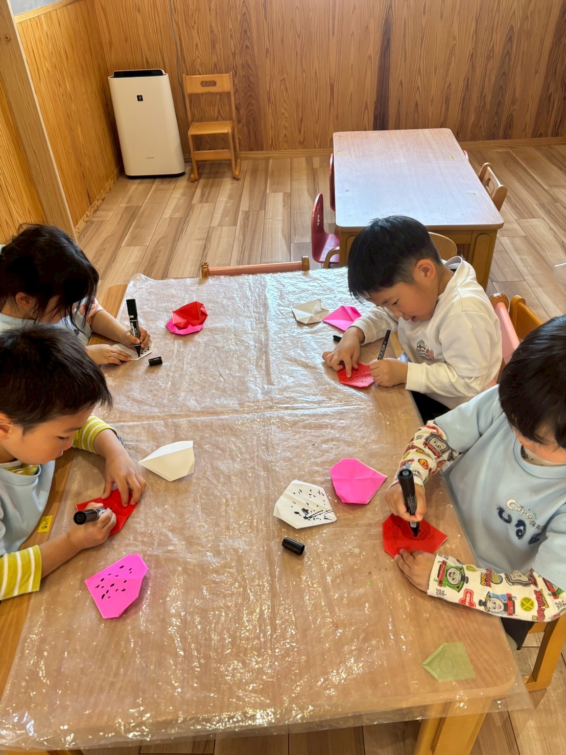いちご🍓を折って種を描いて作りました☺️少し難しそうでしたが、慣れていけるように折り紙もこれから練習していきたいです😁【くりえいと園の今日の給食です】