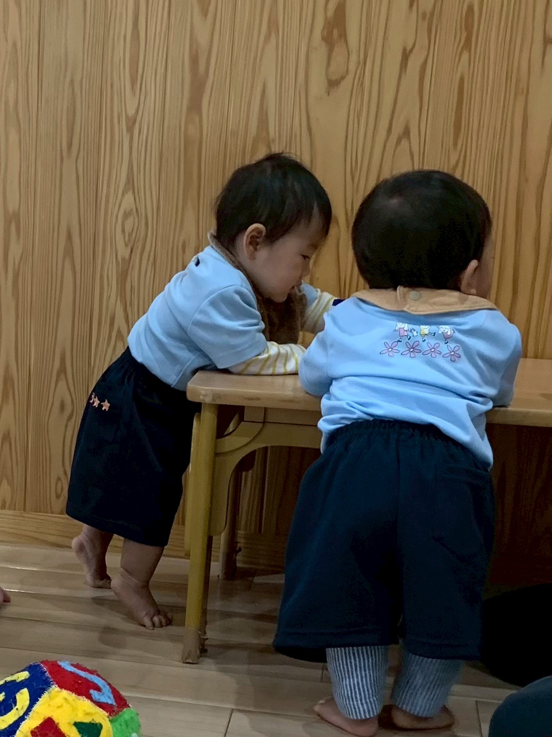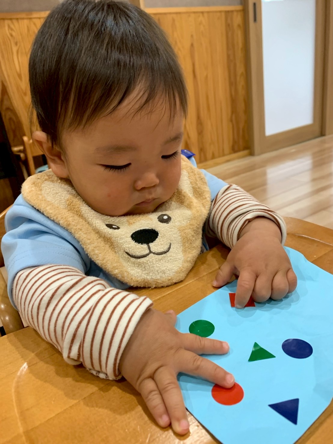 今日は初めてのリトミックでした🎵初めての先生にどんな反応をするのか、ドキドキでしたが、楽しい事が始まるのがわかっているようで、まゆみ先生に釘付けのひよこ🐥さんでしたよ💕シフォンスカーフやフープを受け取り、歌に合わせて揺らしたり、手触りを楽しんでいました✨その後はシール貼りをしましたよ❣️丸、三角、四角のシールを画用紙に貼っていきました😄まだつまんで剥がす、貼るは難しそうでしたが、集中して頑張っていました😃それから、ひよこのお部屋にある玩具を全部出して遊びました💕積み木など、触るだけで遊び方がわからない玩具もあったので先生と一緒に遊んでみましたよ😊ボールを追いかけたり、つたい歩きをしたりと元気いっぱいのひよこ組のお友だちでした✨