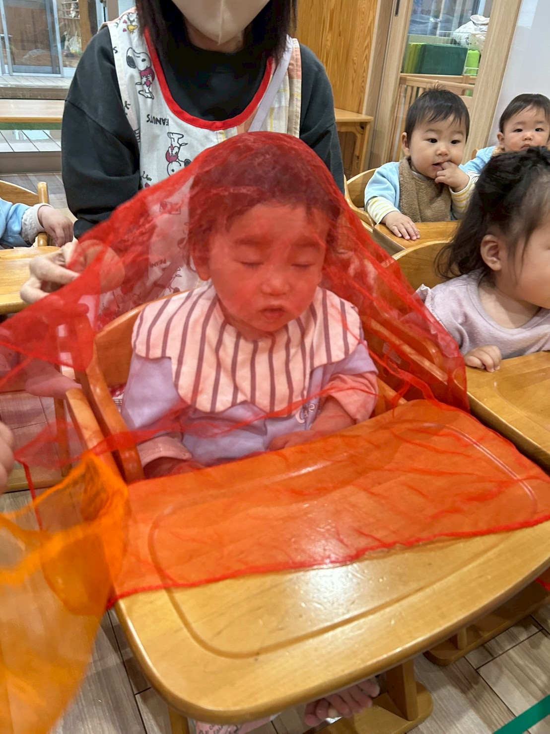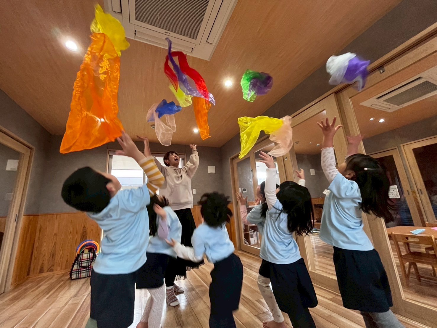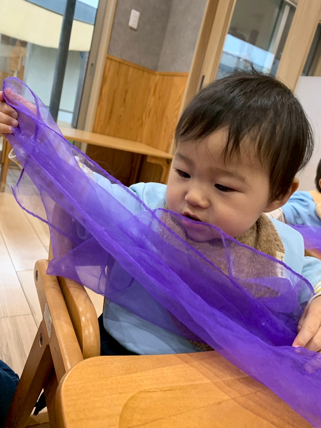 カラースカーフは自分の好きな色を選び丸めたりふわふわにしたり上に投げたりして楽しんでいました🥰