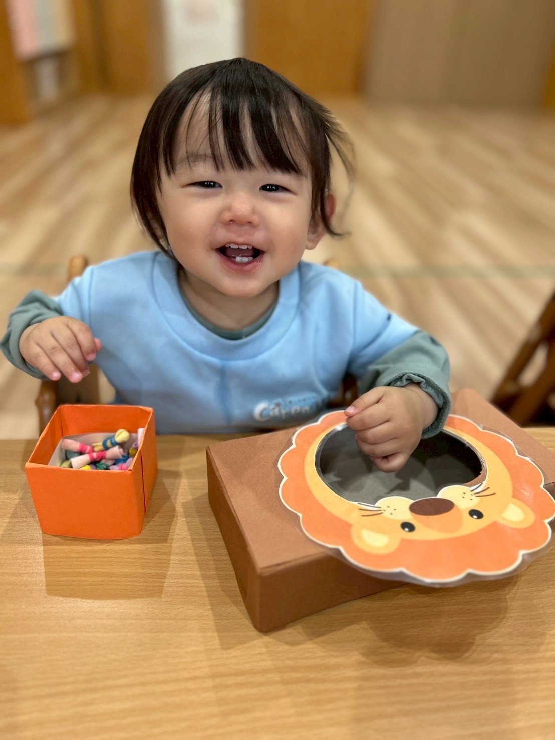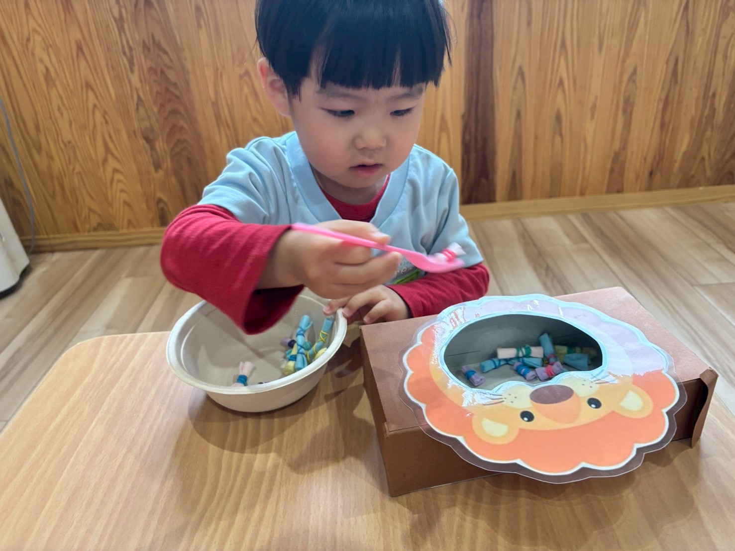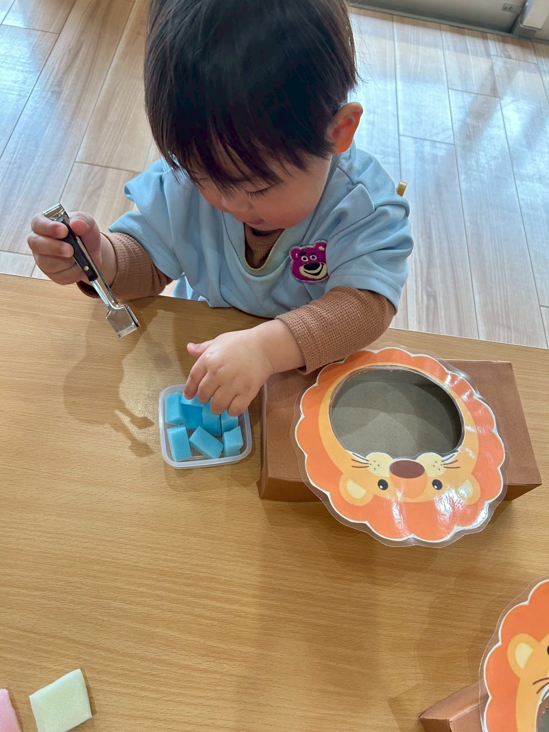 トングを使って上手にスポンジを箱に入れる子もいれば両手を使って考えながら入れる子もいました☺️