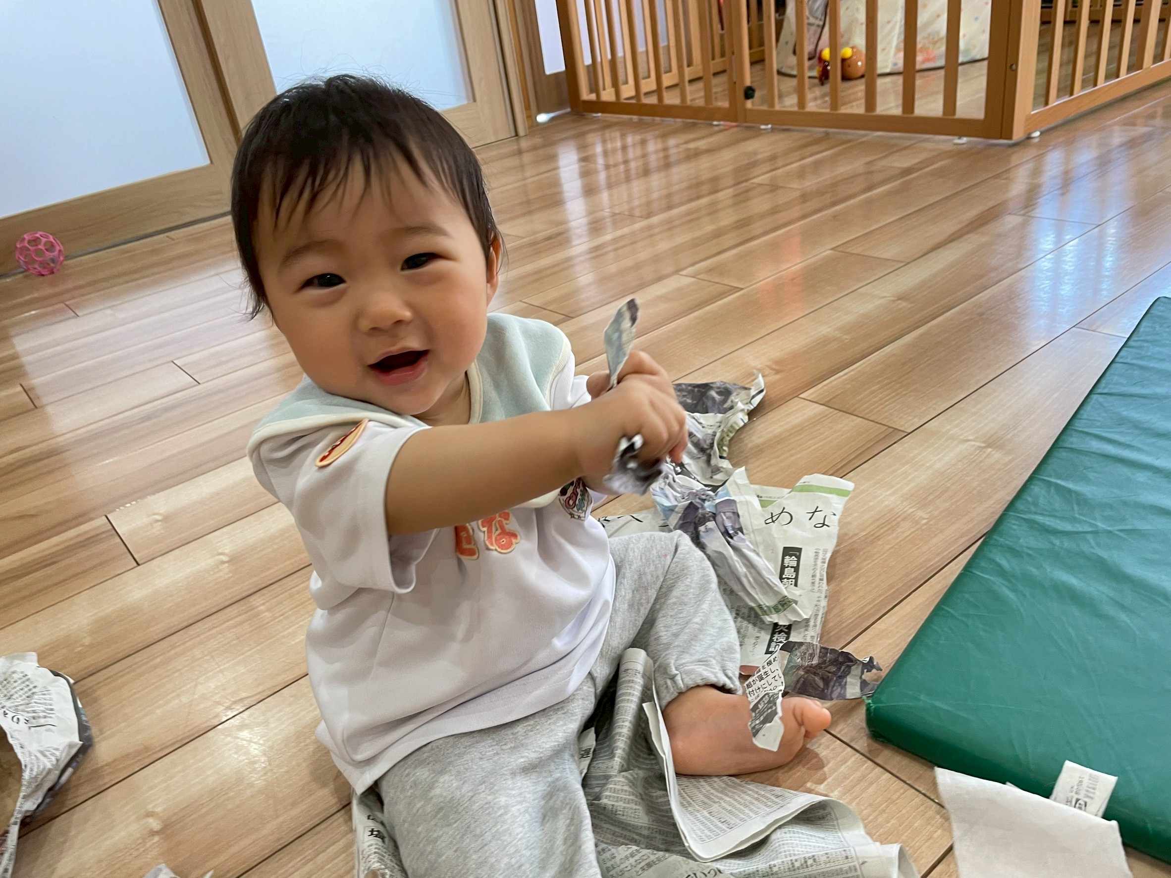 新聞紙を渡すと自分で破ってみたり、くしゃっと握ってみたり、丸めた新聞紙ボールを大事そうに持つ姿が見られました🥰