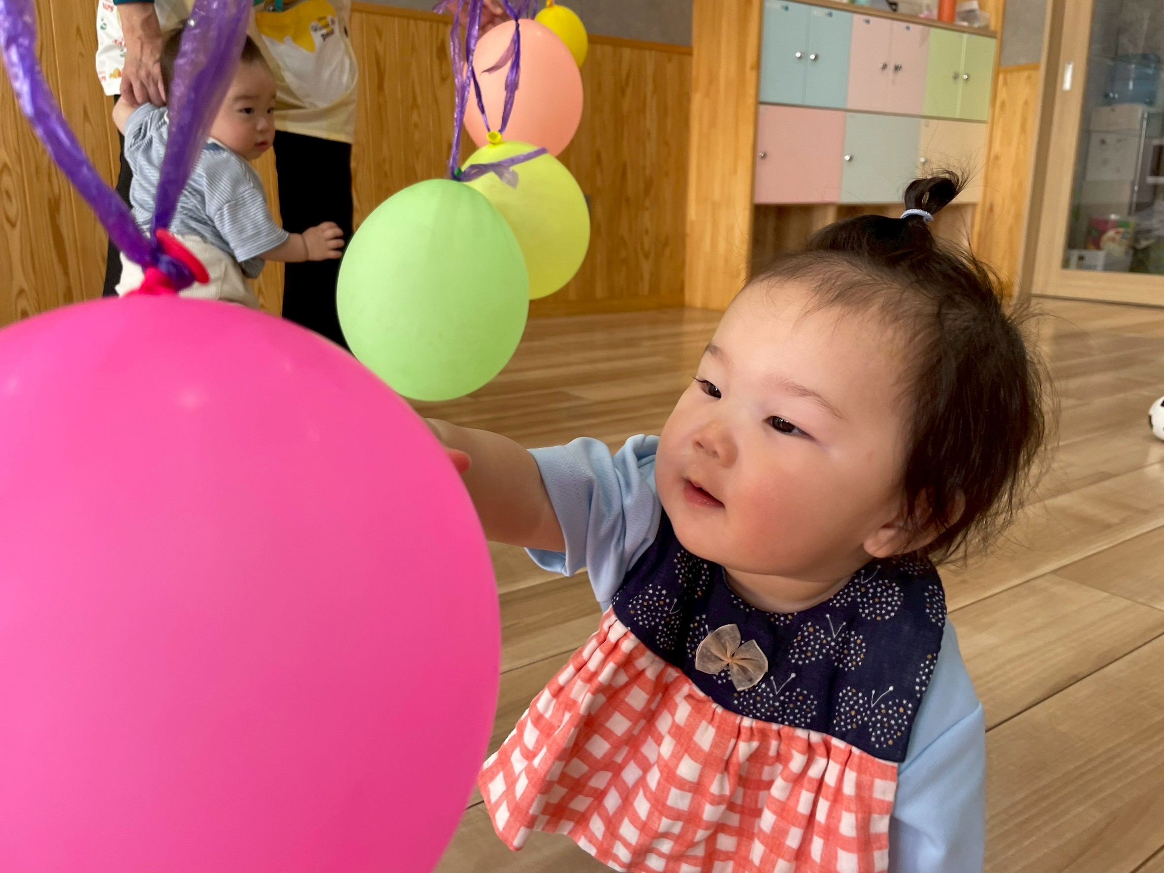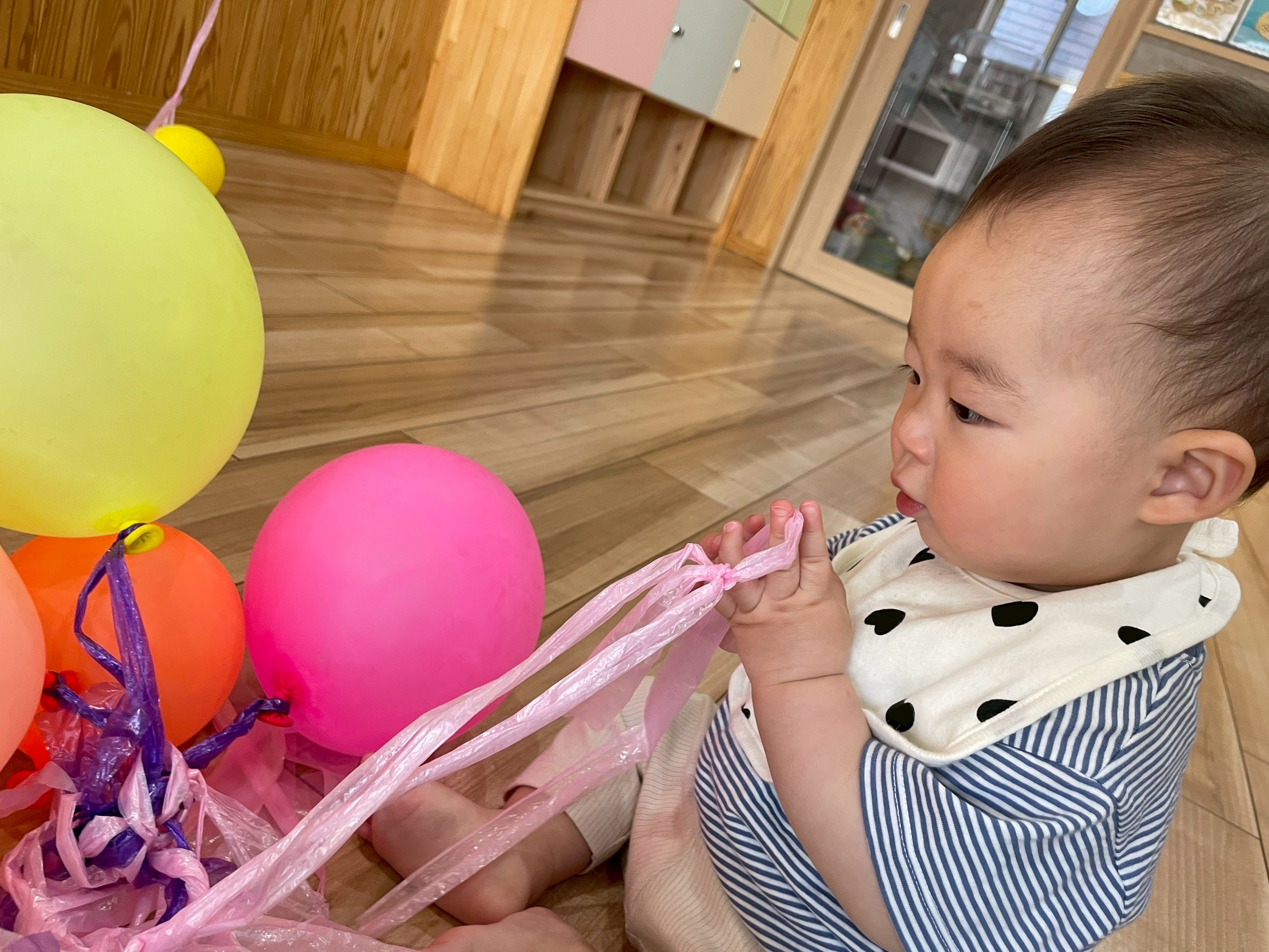 風船のカーテンをハイハイでくぐったり、手を伸ばして触っていましたよ✨