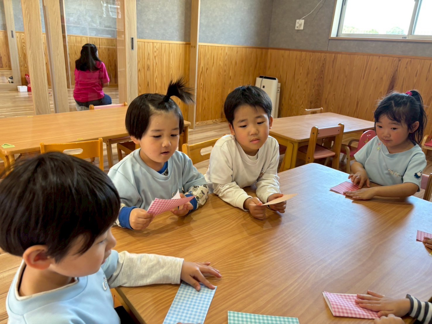 先生の指定した色の卵のカードをポットンと落として遊びました😄
