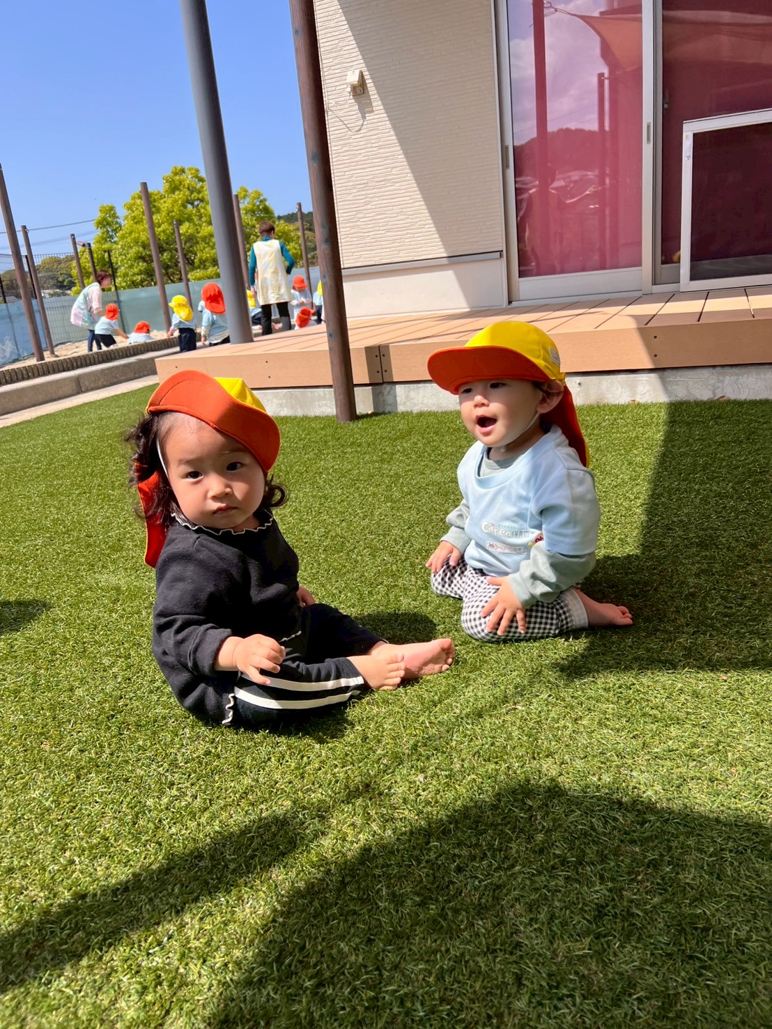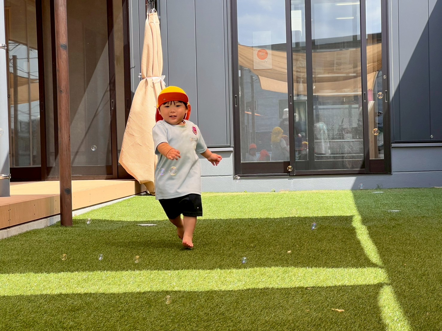 その後は園庭に出ました!飛んでくるシャボン玉の間を走ったり空まで上がるしゃぼんだまを見つめていましたよ🫧ぱんだ組 🐼