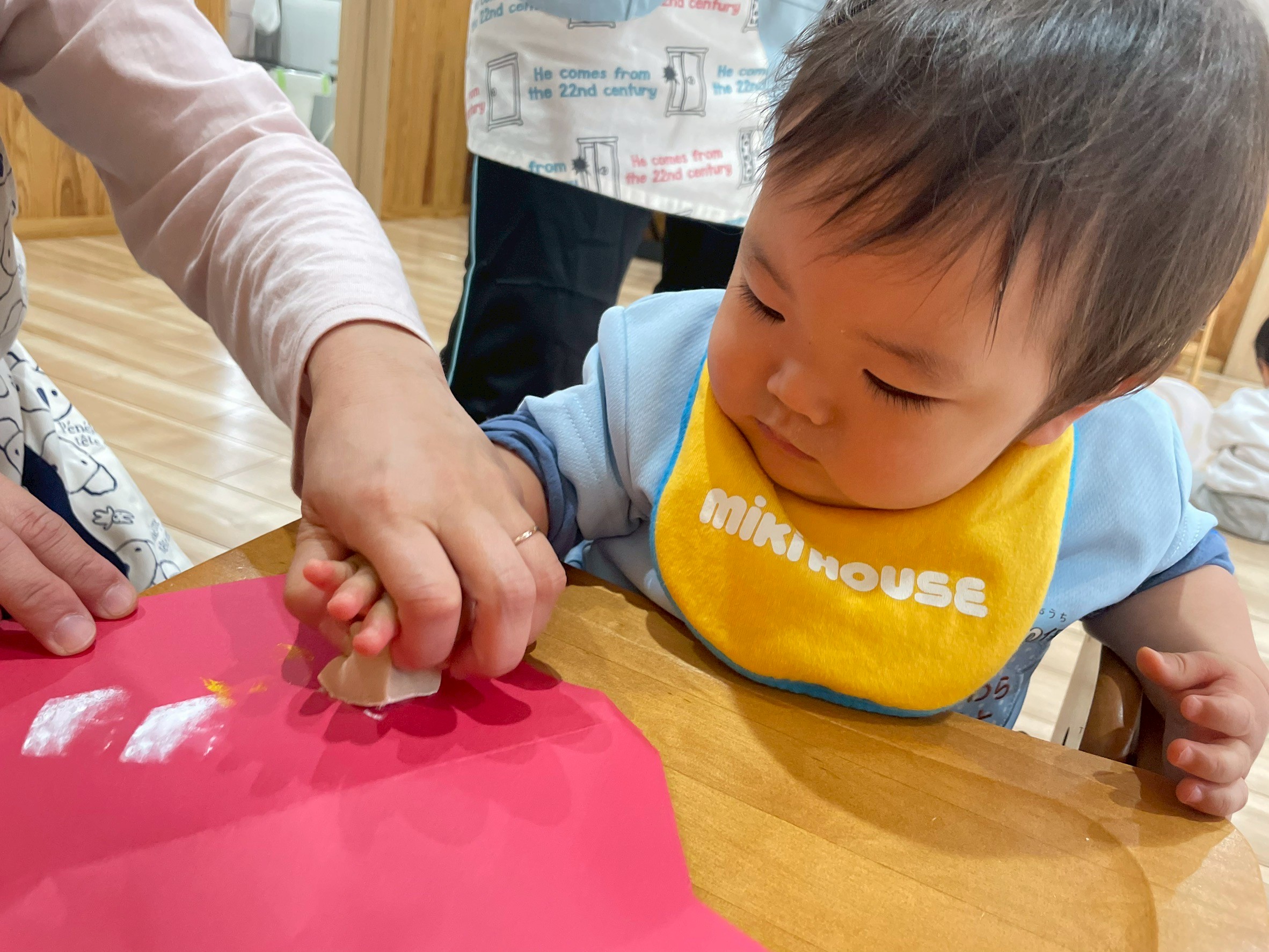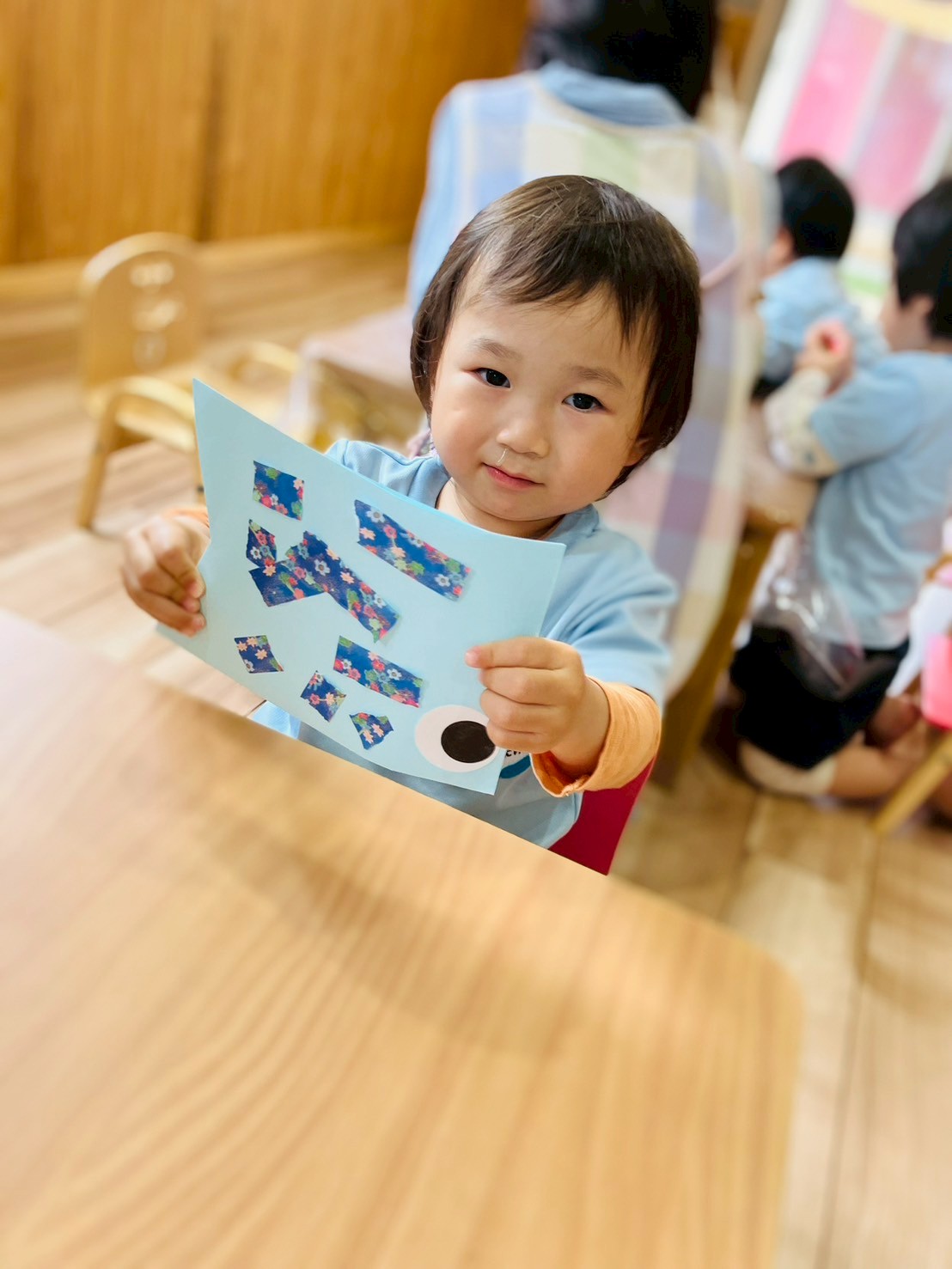 好きな柄を2種類選び、手でちぎって、保育者にのりをつけてもらい好きな所に貼りましたよ☺️