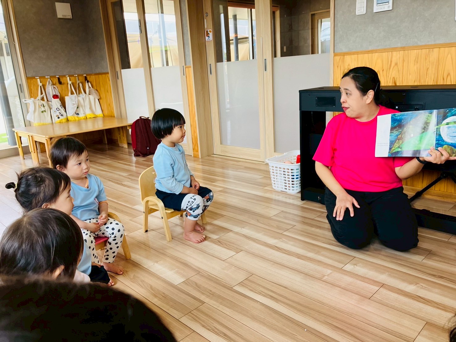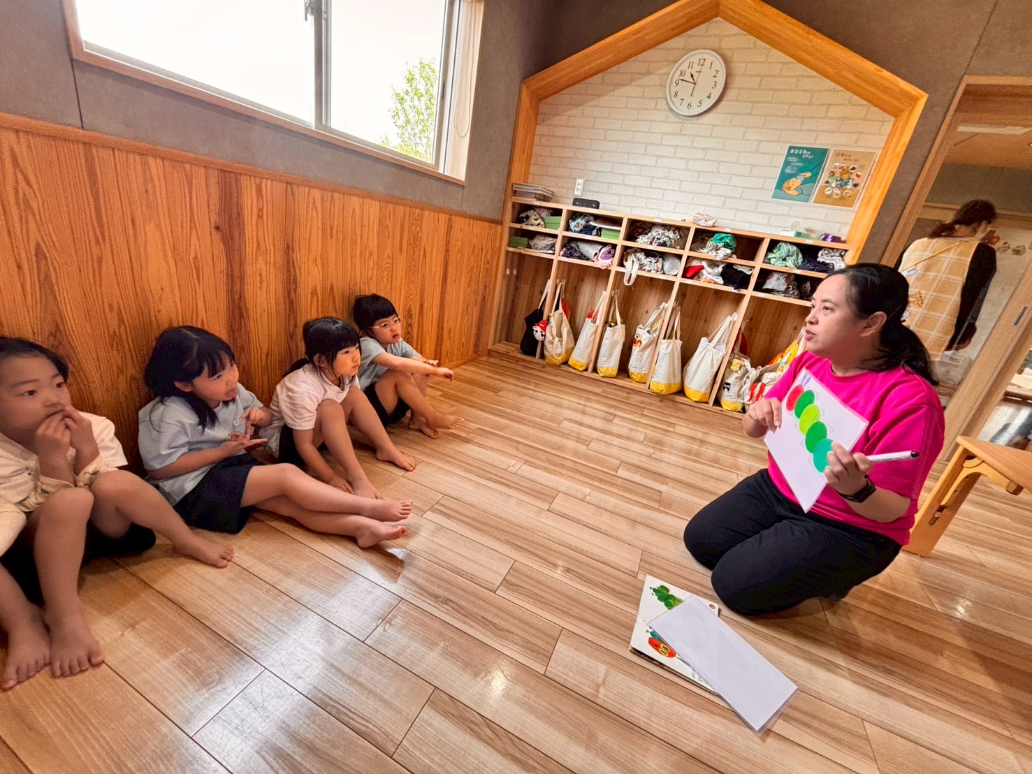 今日は英語教室で「はらぺこあおむし」を読んでもらいました😊「アップル」や「オレンジ」など果物の英語にふれて楽しみましたよ🍎🍊チャリナ先生の魅力溢れる英語に、集中してお話を聴いていた子ども達でした✨その後、私が「いろいろバス」の絵本に出てくる物を英語で表現していると、「オクトパス」にはまった子ども達🤭何度も繰り返しみんなで言っていましたよ🐙🩷ダンス遊びでは、ハワイアンな曲調に、ゆらゆら揺れながら、一緒に真似をして踊ってくれました😊これからみんながノリノリで踊れるように、少しずつ練習していこうと思います🥰