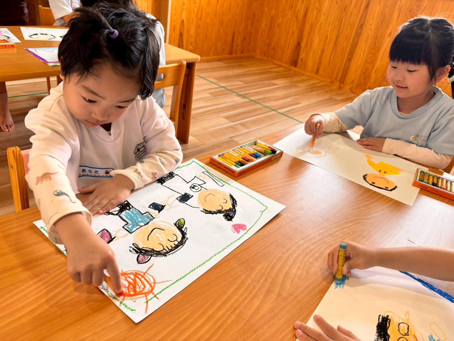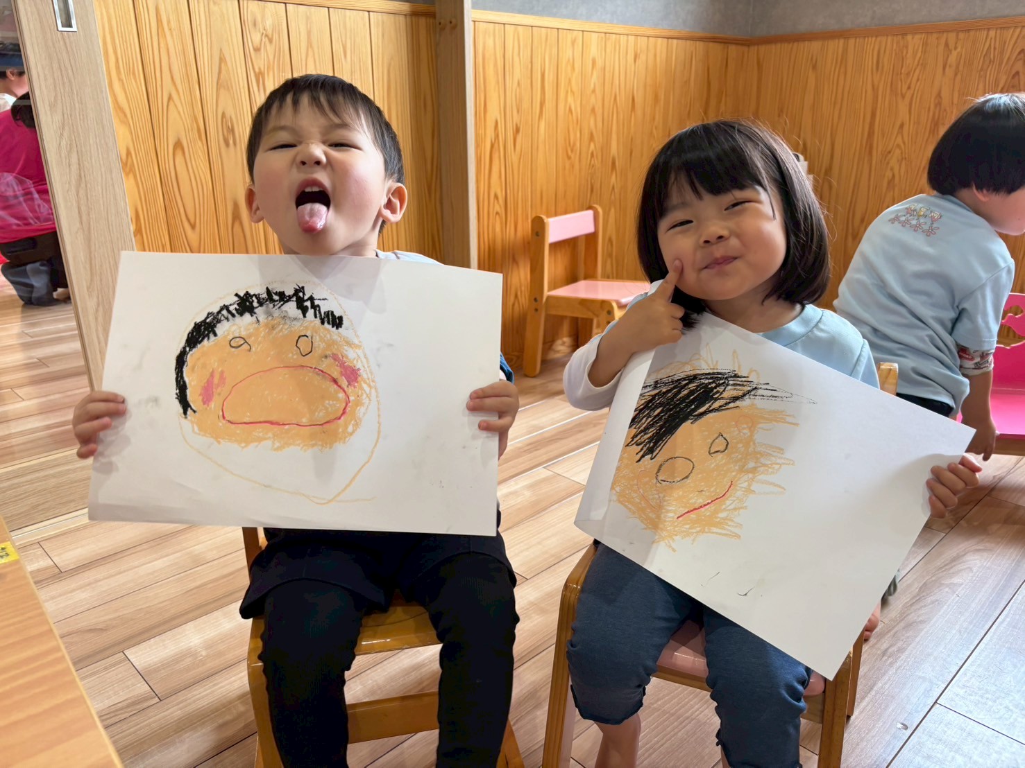 みんなすぐに完成させ「キャタピラー」と大きな声で言えてました🥰英語教室のあとは自画像を描きました😌💕