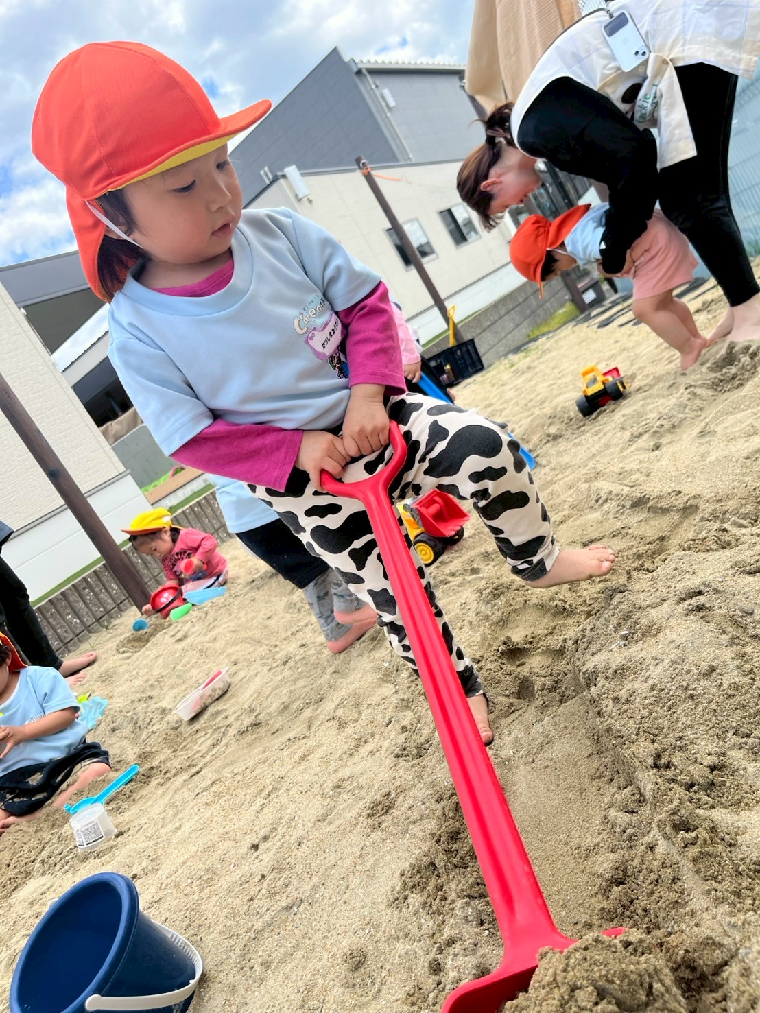 砂場遊びもどんどん上手になっていて砂の感触をたのしんだり、スコップですくってカップに入れたりお兄ちゃんが大きいスコップでほっているのも見て真似して着いていくお友だちもいました🤭💖ぱんだ🐼