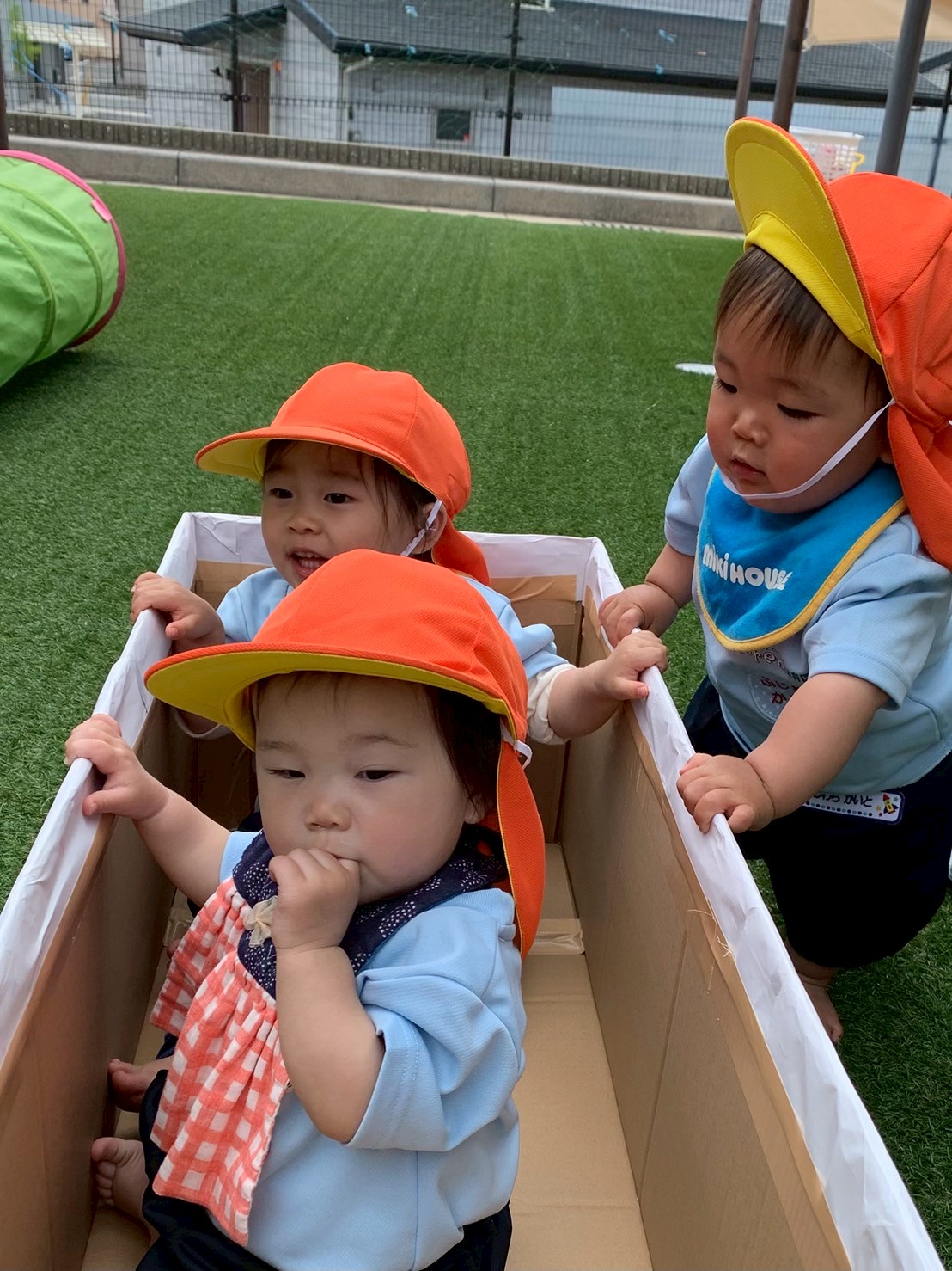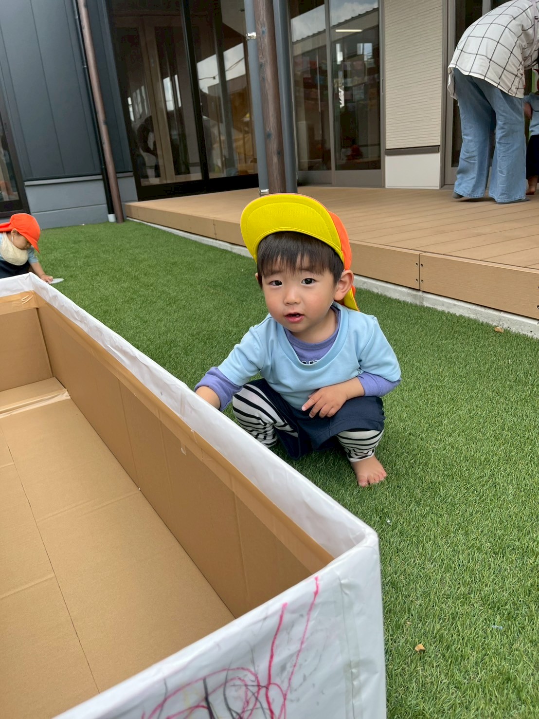 その後も園庭でりす組🐿️さんやぱんだ組🐼さんとトンネルくぐりや長い段ボール電車に乗ったりして楽しみましたよ😊