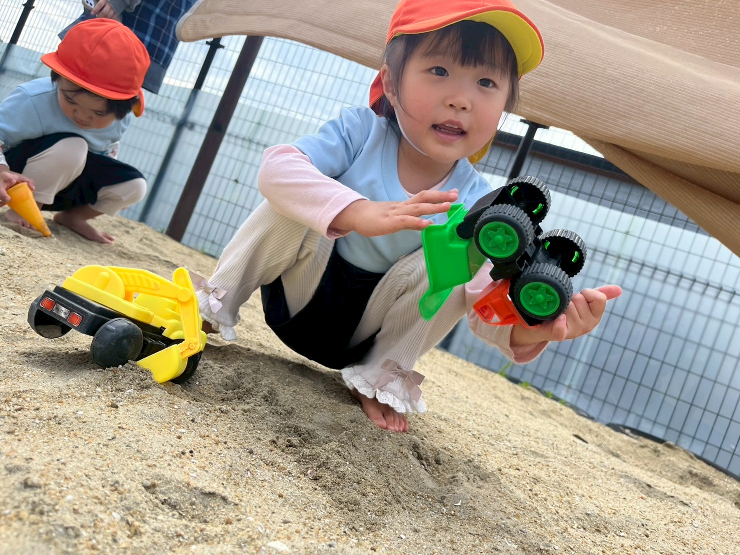 砂場やトンネル、ひよこ組さんが遊んでいた電車にも入れてもらって楽しそうな様子でした☺️
