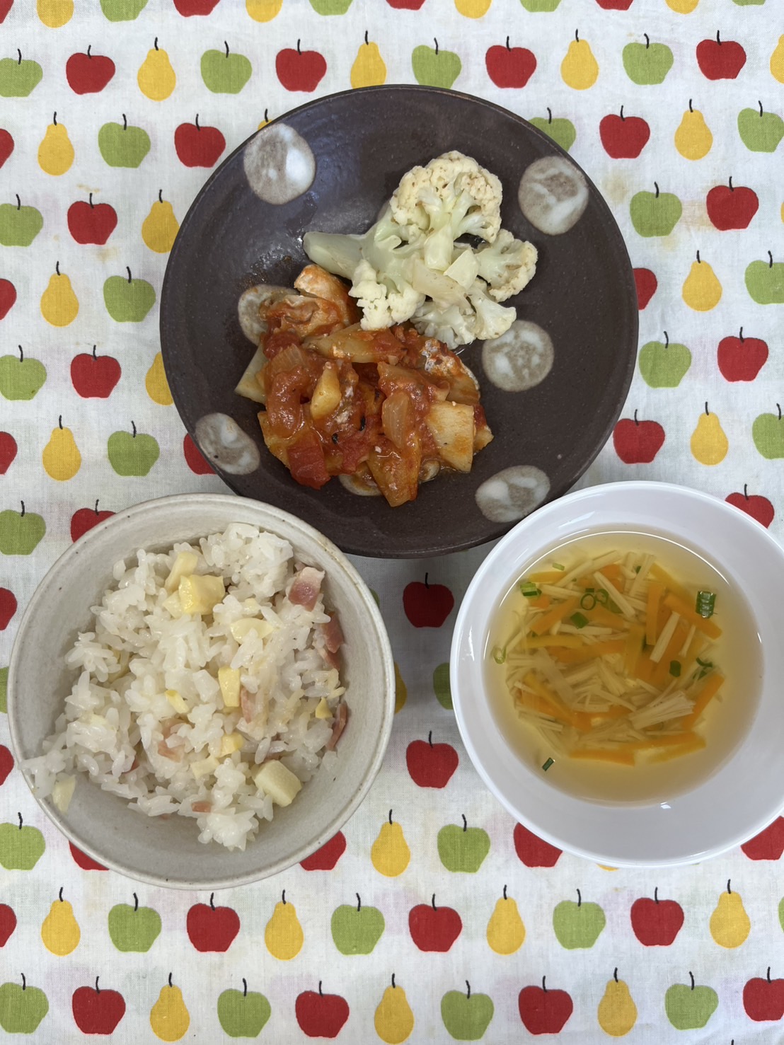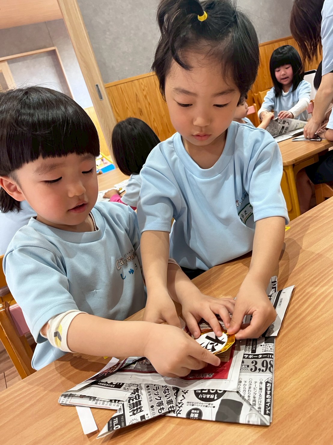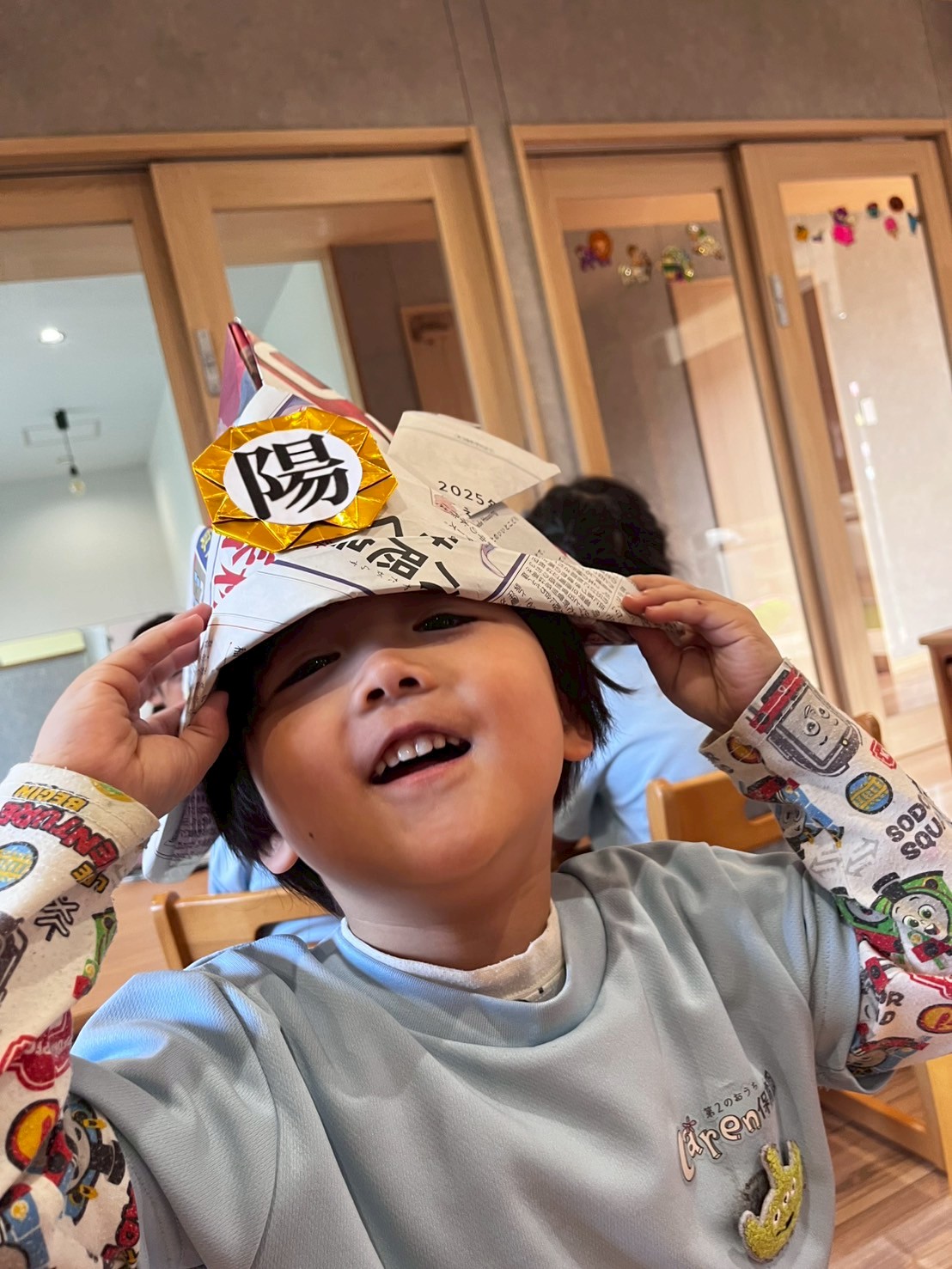 端午の節句🎏に向けて新聞紙で兜を作りました✨保育者の説明を聞きながら折り進め、名前の漢字が貼ってあるメダルやシールなどで兜を飾り、自分だけの兜を完成させました🥰うさぎ組が兜を作る時は、きりん組が隣で手伝ってくれました😚💕【くりえいと園の今日の給食です】