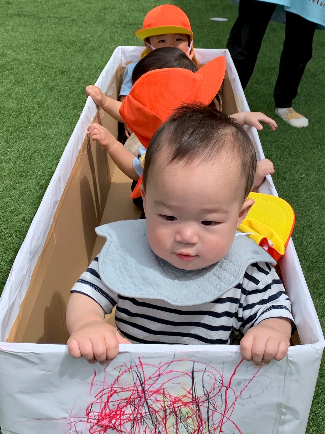 ひよこ組さんがダンボール電車に乗っていたので一緒に乗せてもらいました♡1番前の席が人気でお友だちと順番に交代しながら乗っていました🥰また小さいお友だちにも優しく声をかけてあげていたパンダぐみさんです😁うさぎこあらきりん組🐰🐨🦒