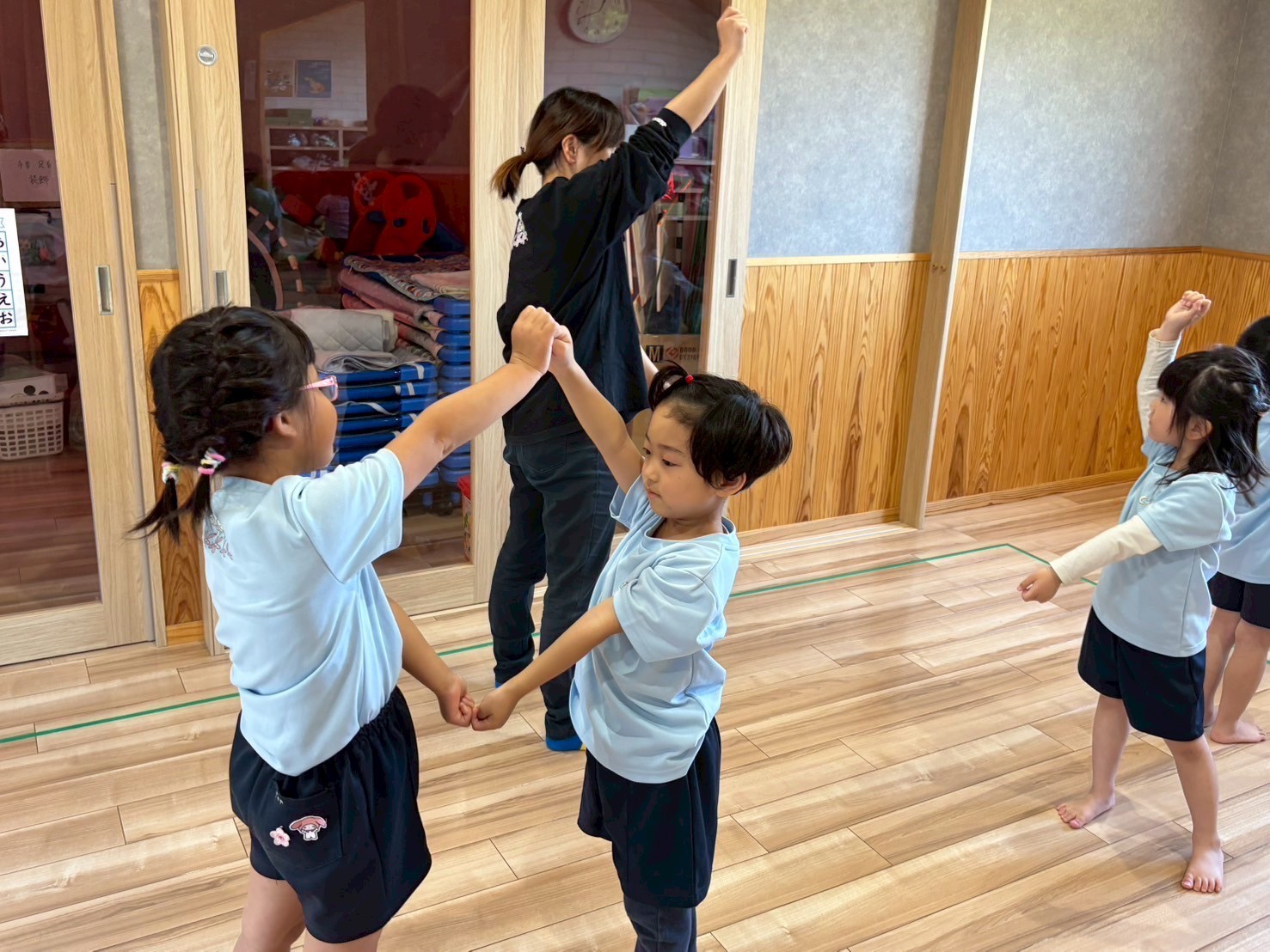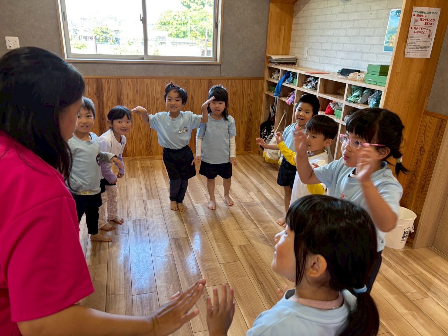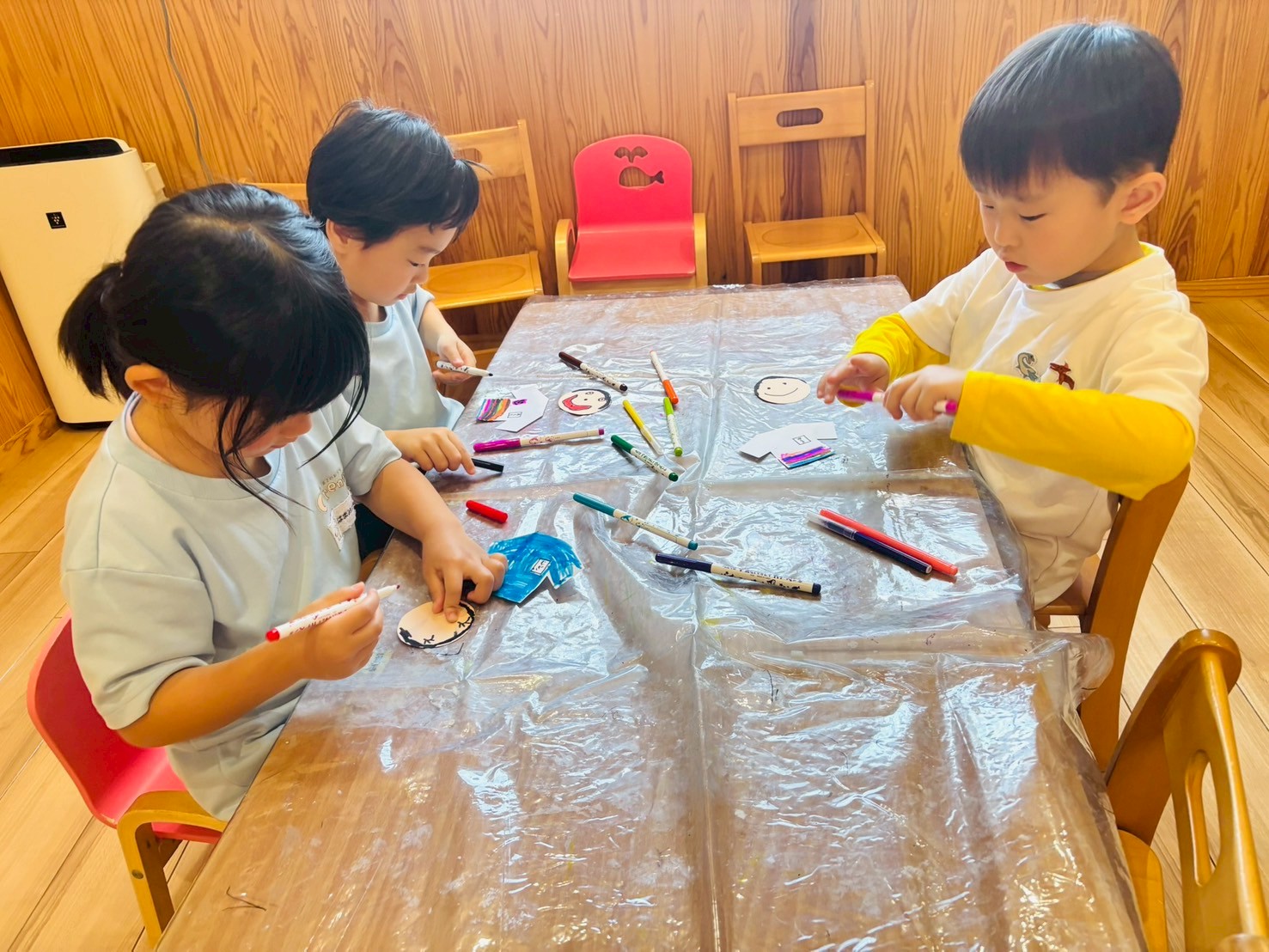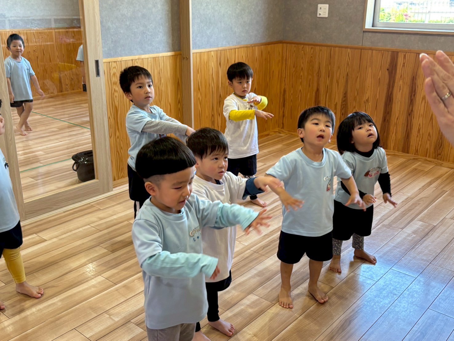 英語を待つ間は当番表作りをして、自分の顔や洋服を自由に描きました😊👕こあらきりん組はお手本を見ながら顔を描いて洋服の色もこだわって塗っていました💕うさぎ組は保育者に手伝ってもらい、顔のパーツを確認しながら描くことができましたよ🫶🏻その後きりん組、うさぎこあら組に分かれて運動会遊戯の練習をしました🏳️🌈どちらの遊戯も聞き慣れた曲で、みんな楽しそうに練習ができていました😚✨