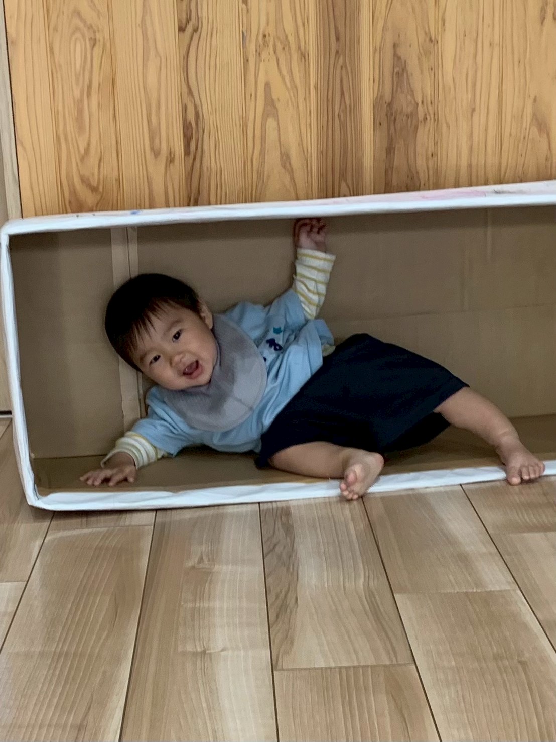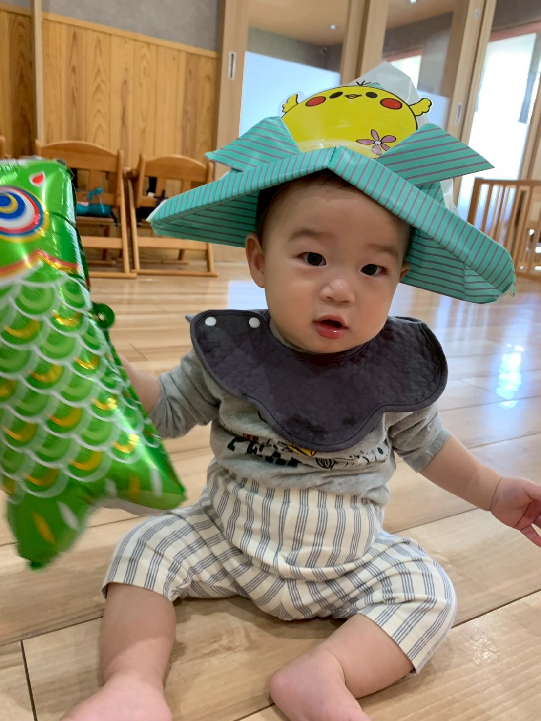 その後はその段ボール電車に乗ってお部屋の中を移動したりして遊び、もうすぐ「こどもの日🎏」なので、ひよこ兜をかぶってみたり鯉のぼりの形の風船を捕まえて遊んだりしましたよ😄