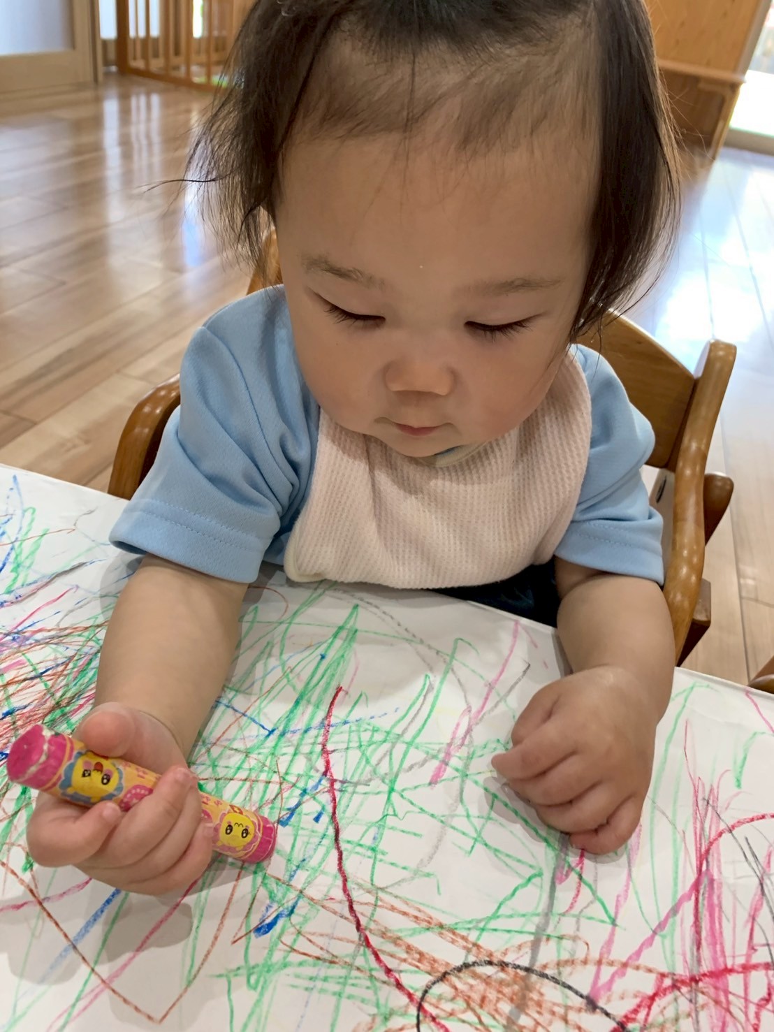 クレヨンを先生と一緒に持ってぐるぐると色を着けてみました❣️