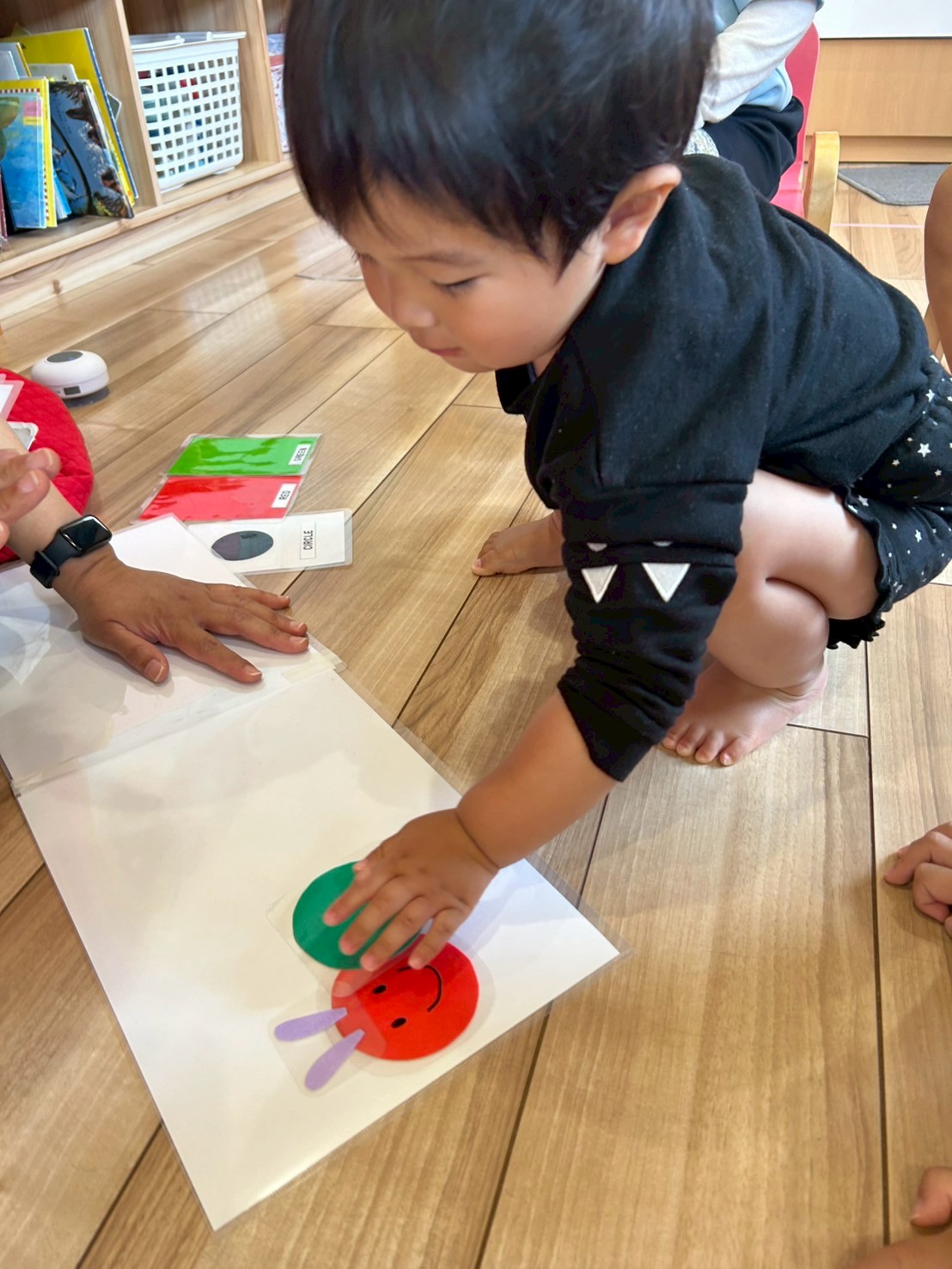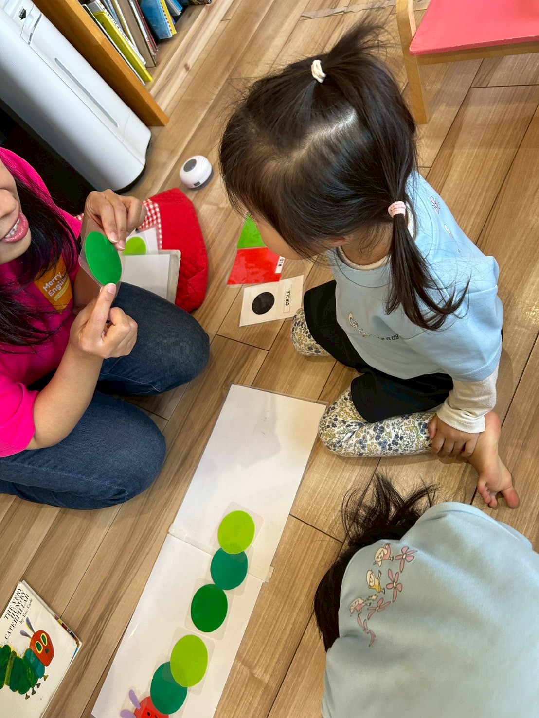 今日は最初に英語教室に参加しました。朝の挨拶の「グッドモーニング👍🏻』からは始まりました。上手にグッモーニン😮と挨拶できたぱんだぐみでしたよ。英語でリズム遊びをして最後にはらぺこあおむしの🐛の体を形と色を英語で答えながら貼っていきました🖐️。しっかりと糊付けするようにトントンして貼っている姿がみられました😊