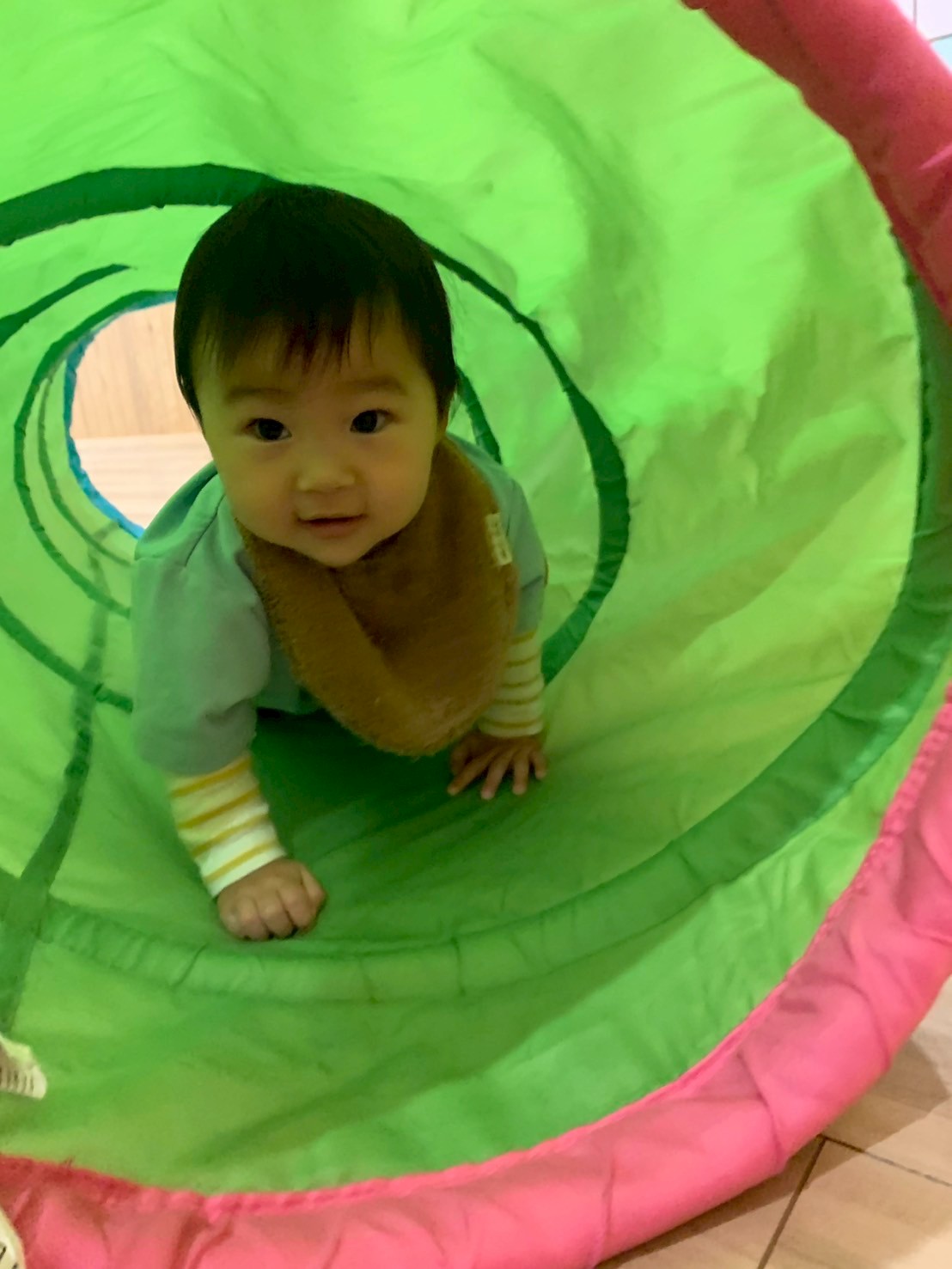 今日はお部屋の中でカメ🐢型のプレイマットや大好きなトンネル、段ボールバスや風船で遊びました❣️