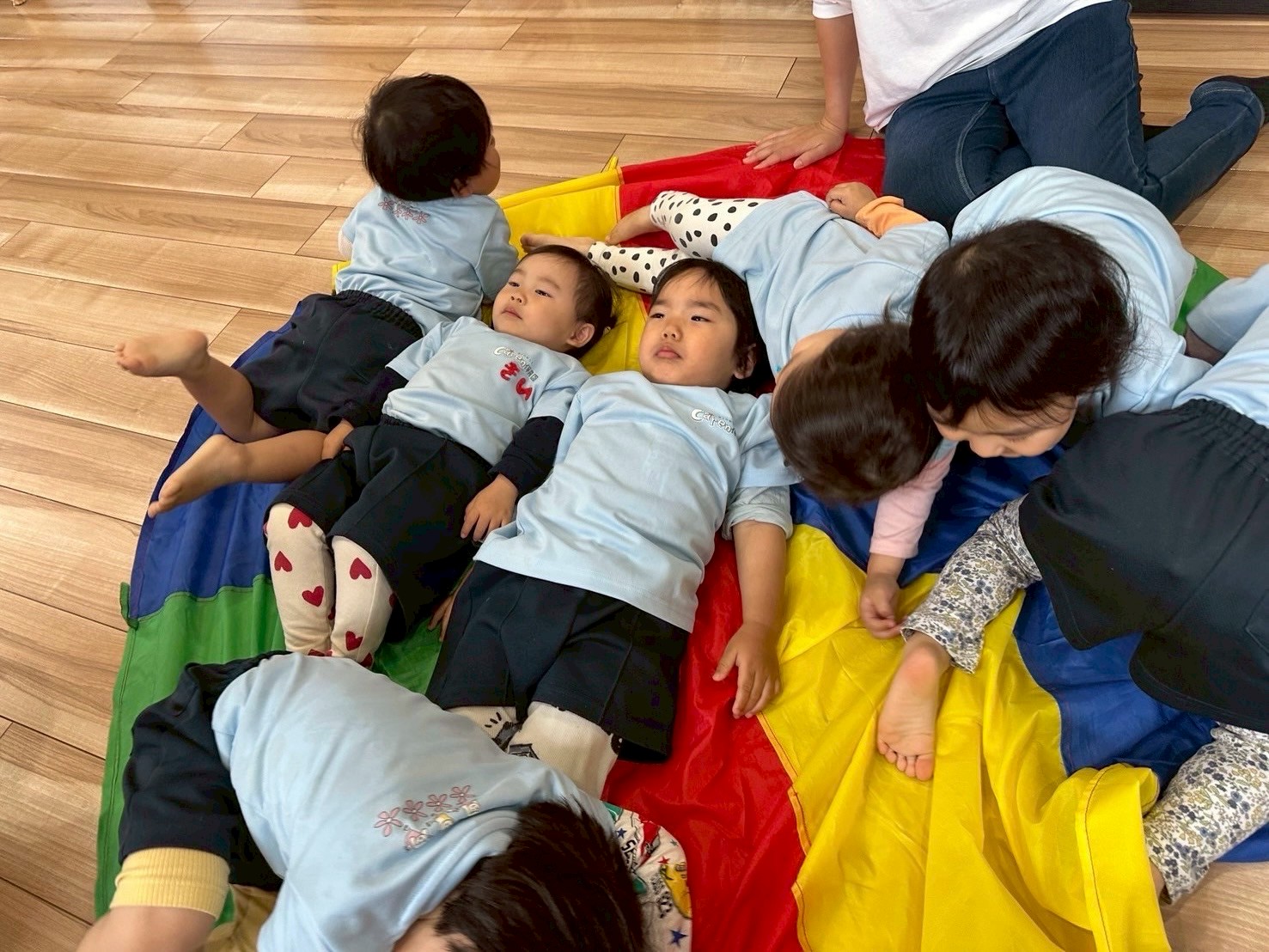 歌に合わせて保育者がフープを引っ張り、子ども達はしっかり捕まりながら、ニッコニコの笑顔でした😁