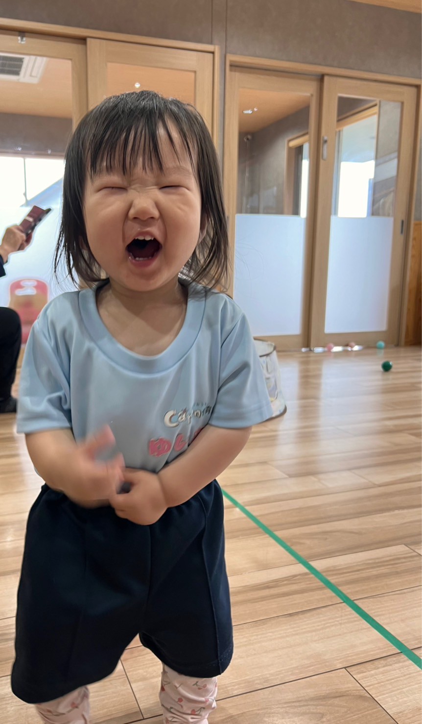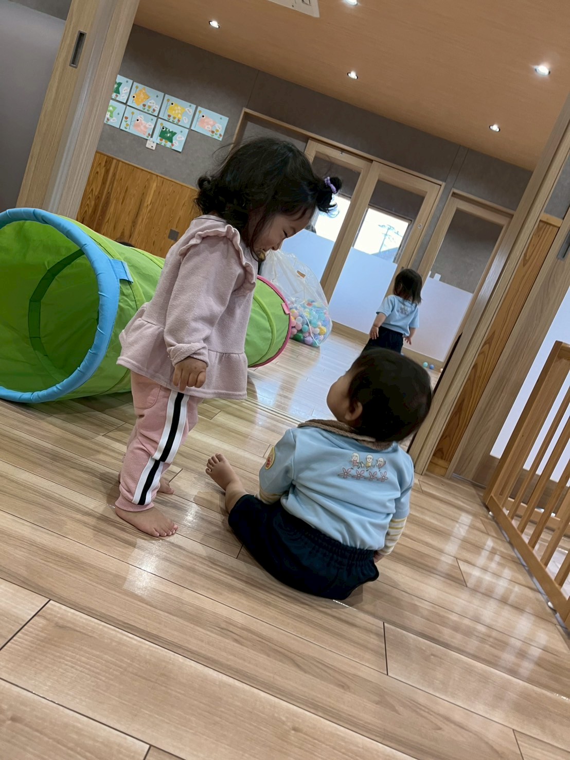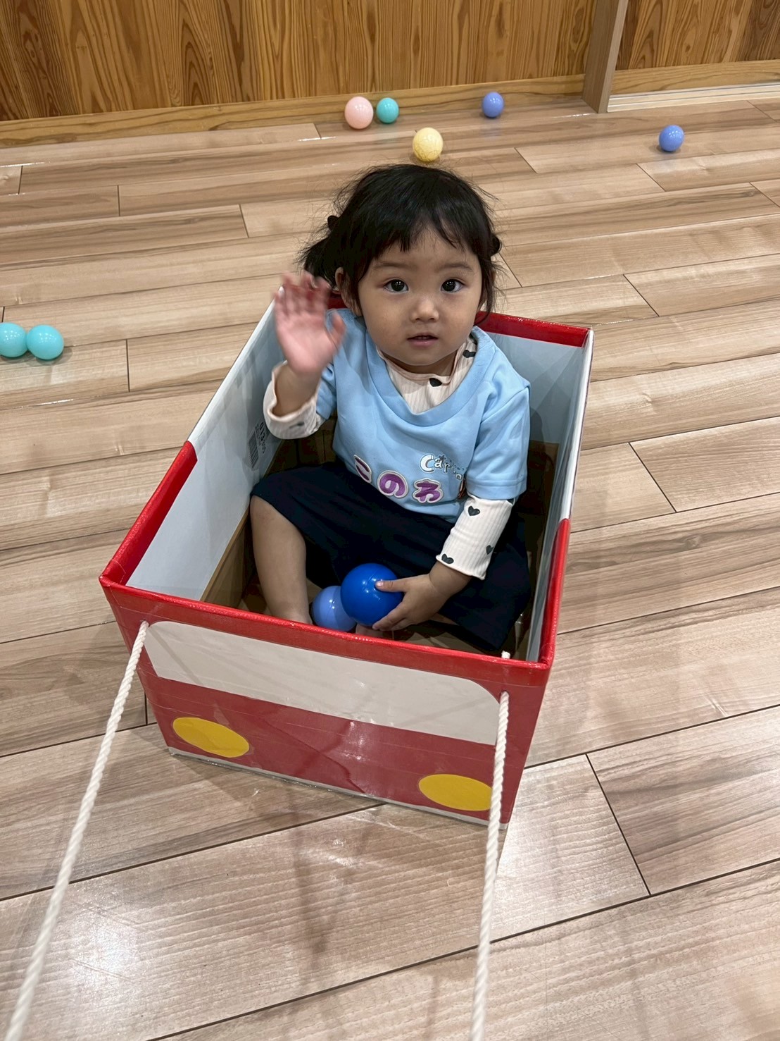 今日はお外が雨のため室内で体を動かして遊びました!手遊びや絵本を楽しんだ後ボール遊びをしましたよ!座って約束事などお話を聞きボール遊びを楽しみました!アンパンマンのお口にたくさんボールを集めるりす組さん✨3つも4つも持って「いっぱーい!」とおしえてくれたり、「あお!」や「あか!」など色を教えてくれるお友達もいましたよ🤭その後はひよこ組さんと交流しながら一緒にダンボールのバスに順番に並んで乗って教室を散歩したり、大きい風船や亀さんマットで遊びました🐢