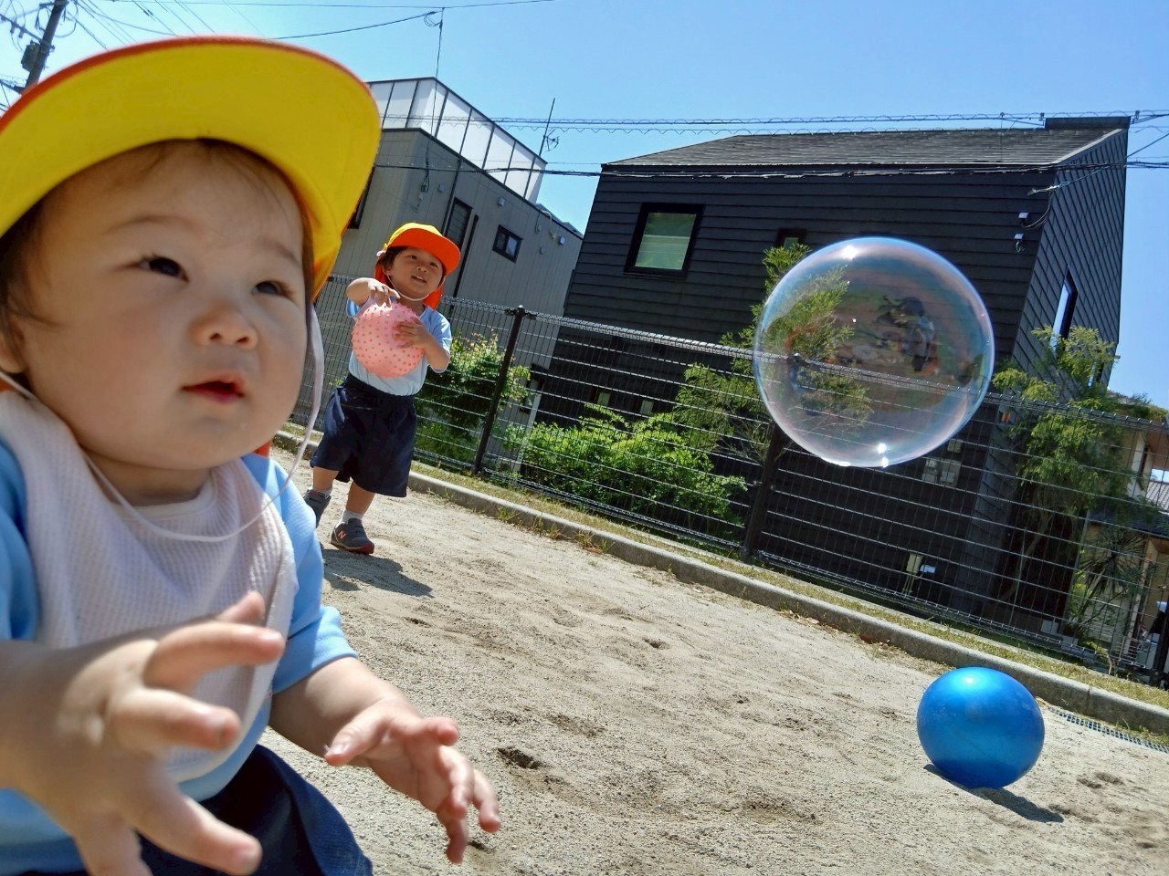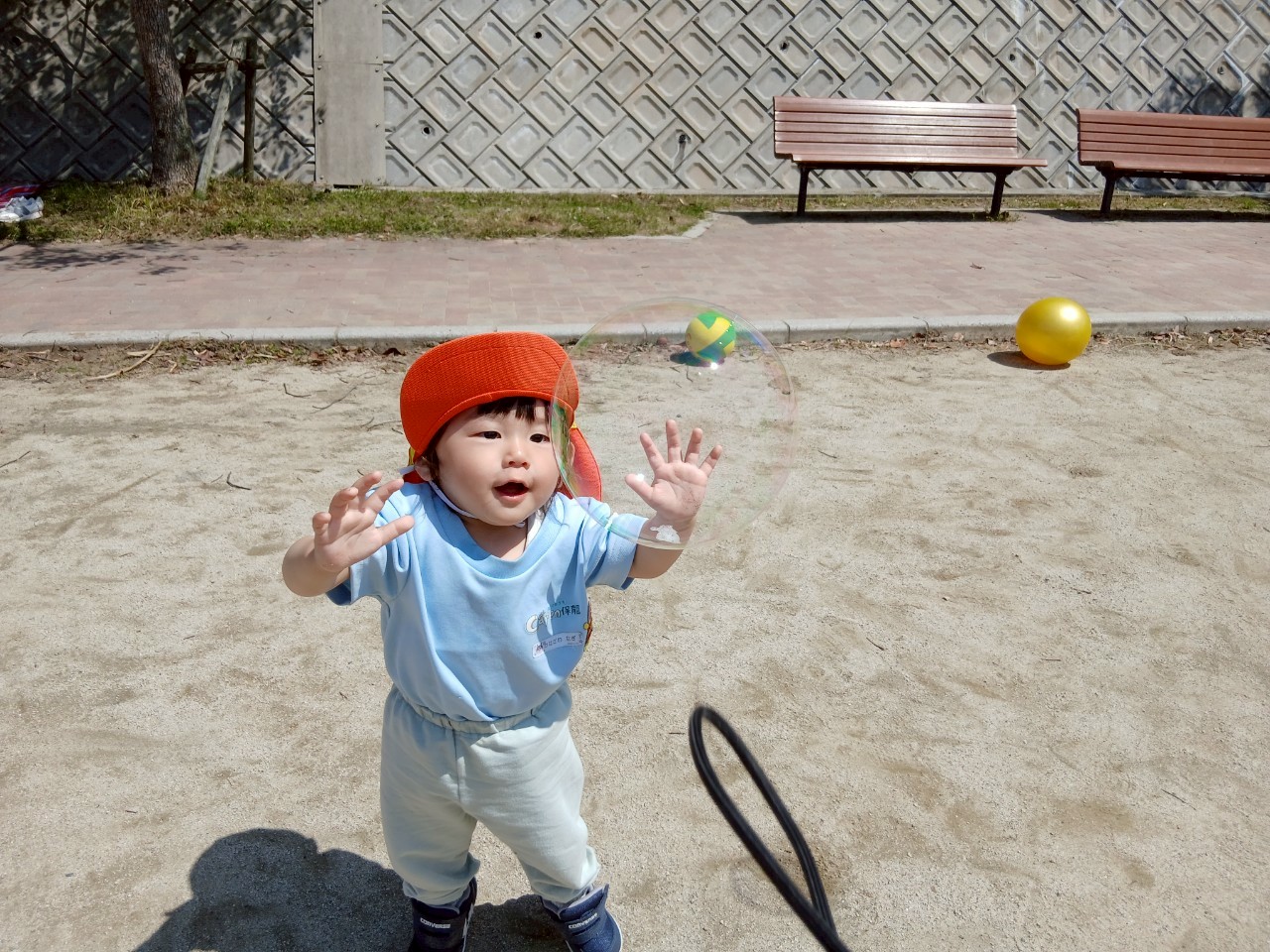 飛んできたシャボン玉を触ろうと手を出したり、目で追いかけていましたよ🥰