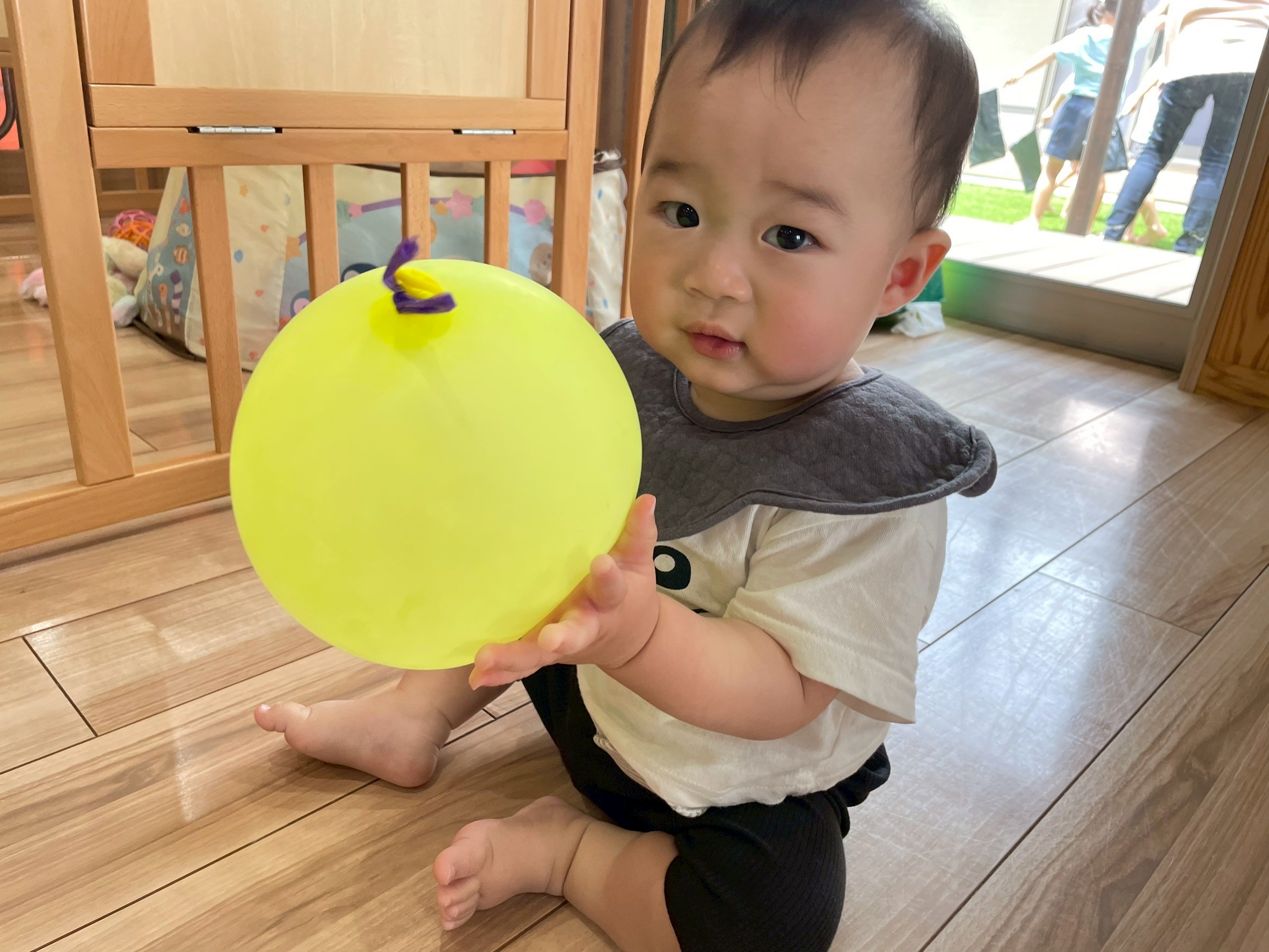 フィンガーペインティングをしながら積み木遊びも楽しみました。いろんな形の積み木を使って積み重ねたり並べたりしながら夢中で遊んでいましたよ♪後半は園庭に行き、ボール🏀遊びや砂場で遊び、お部屋に入る前にほんのちょっとだけシャワーを上から雨のように降らせて水浴びをしました。足を洗う水も『ん😆冷たーい😆』と大興奮なぱんだ🐼ぐみさんでした✌️。