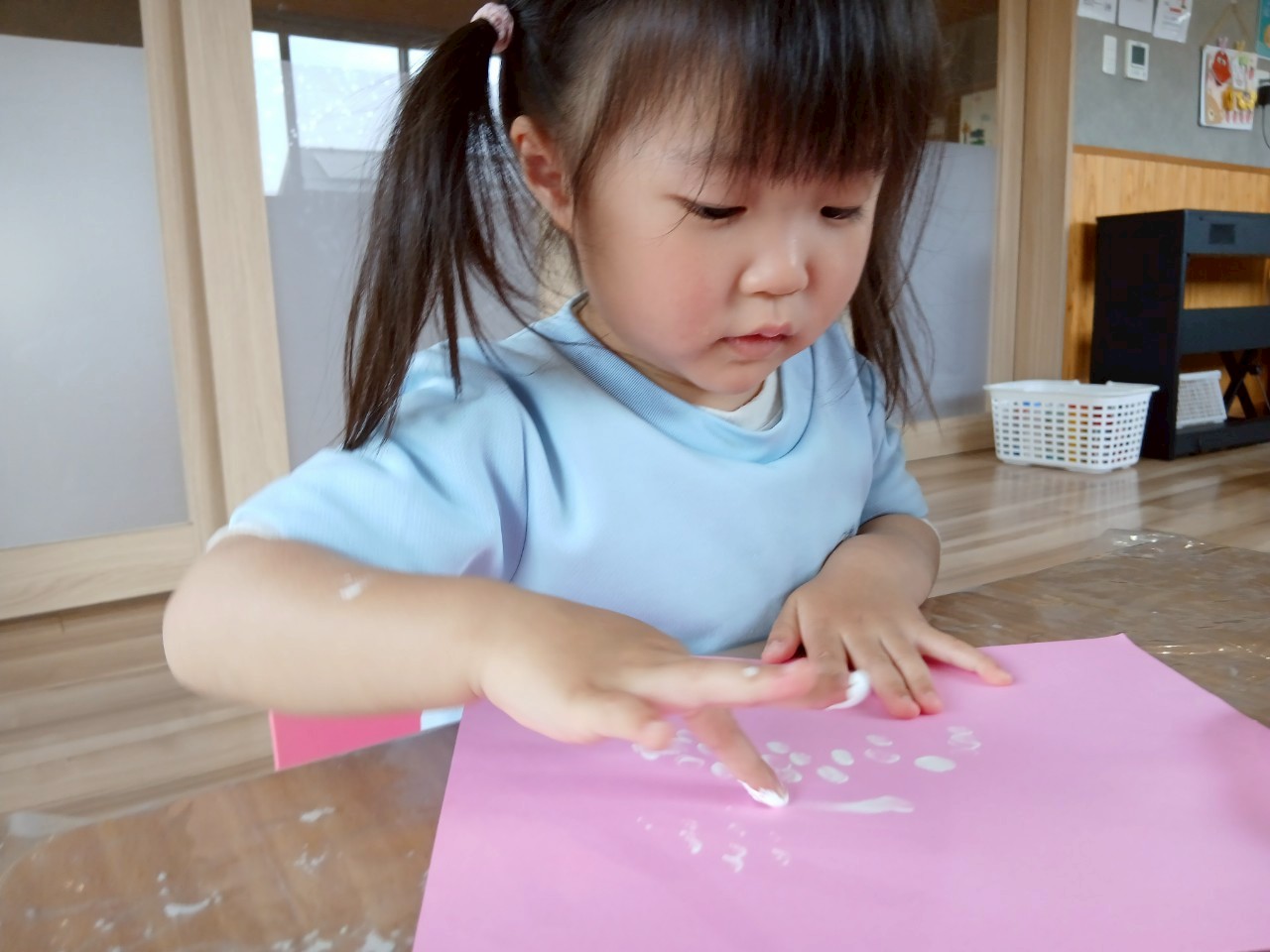 今日は前半にフィンガーペインティング☝️でイチゴを作りました🍓。指に絵の具をつけて上手にチョンチョンとイチゴの粒をつけていきました。最初は1の指でつけていき、チョンチョンとつけるのが楽しくなったようで、どんどん2、3の指と増えていくお友達もいました(笑)みんな集中してたくさんのいちご🍓の粒模様をつけることができました✌