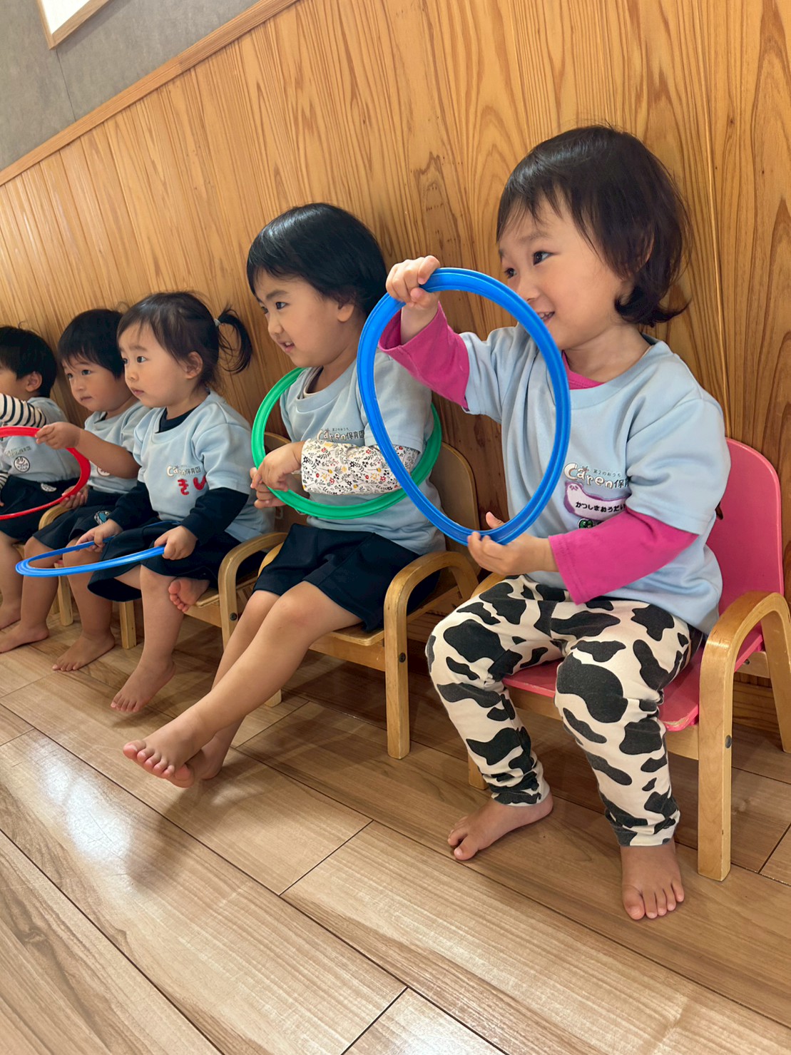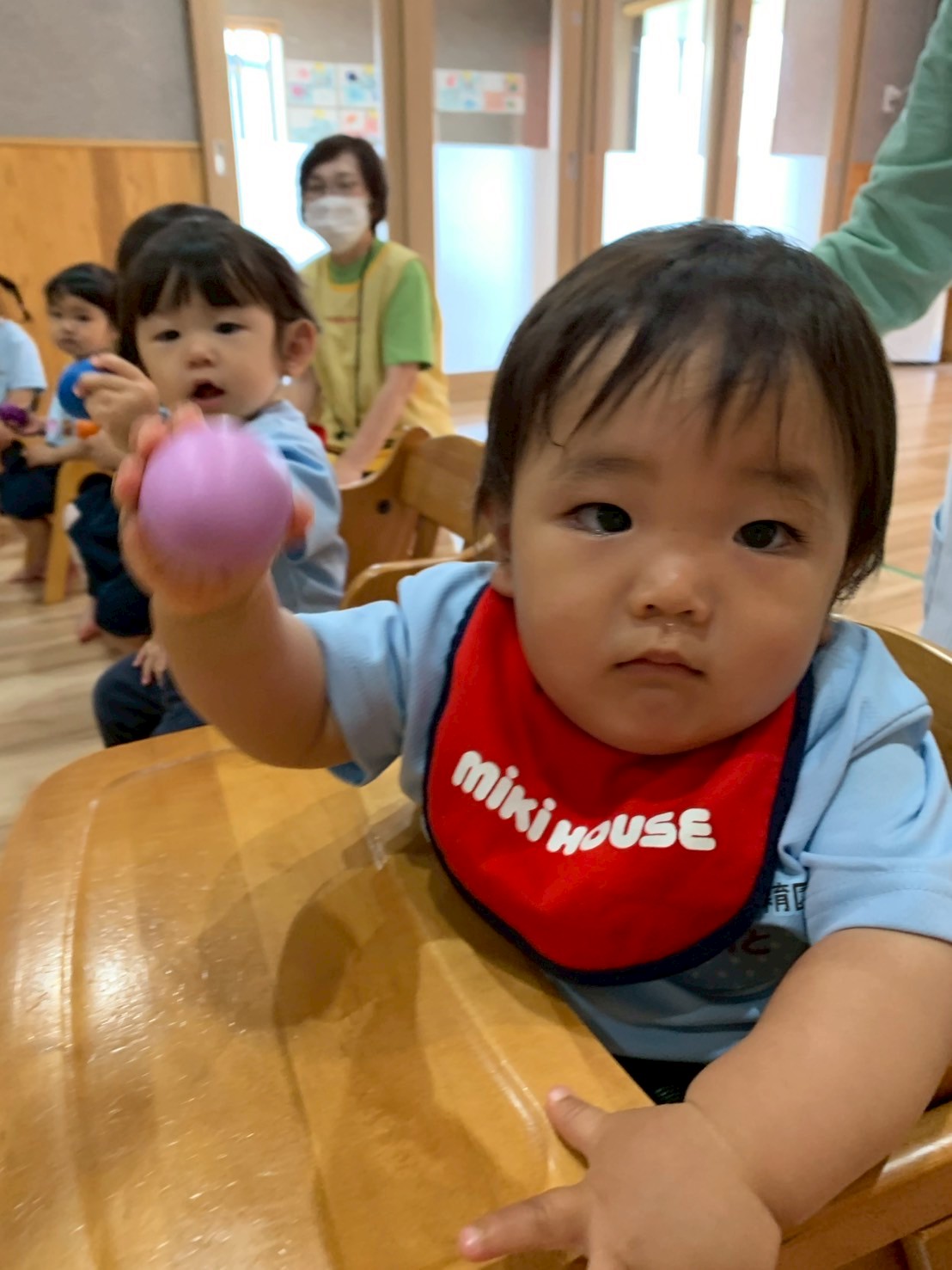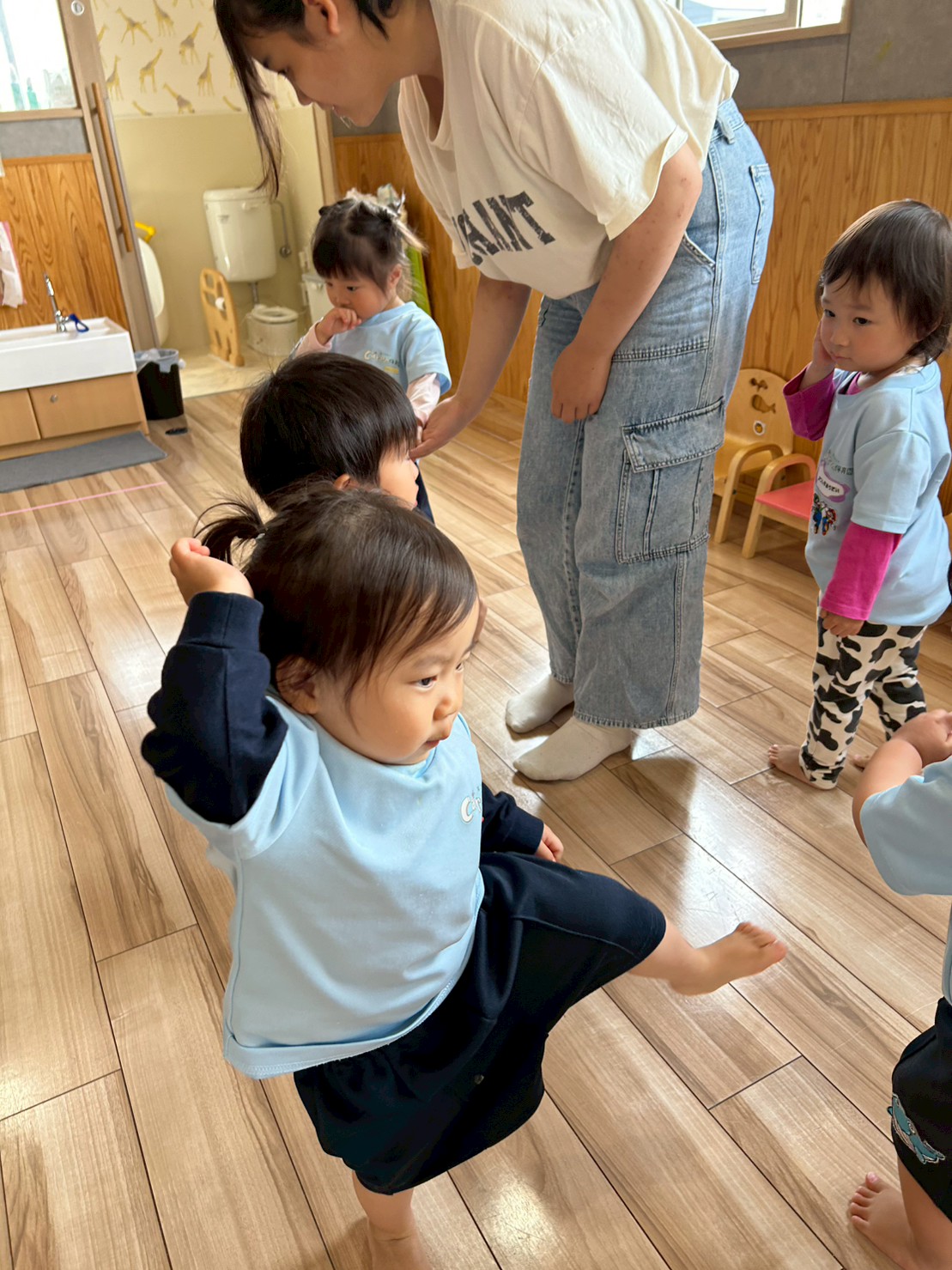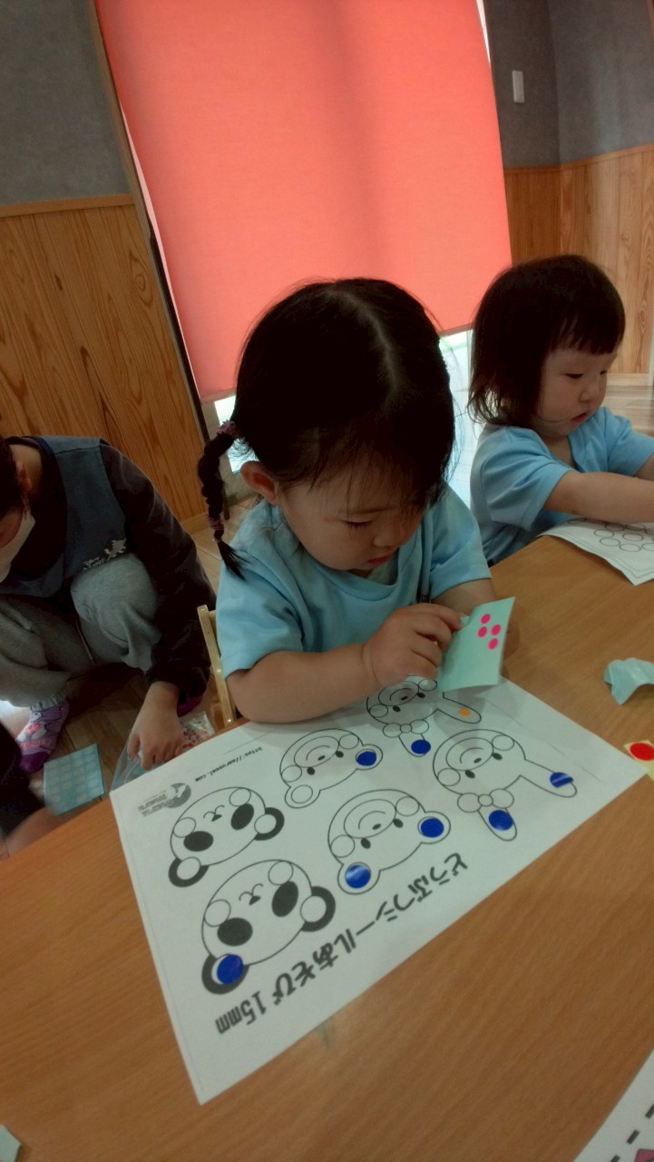 今日はリトミックに参加しました♫「ドアをあけたら〜」の絵本を「とん…とん…とん」と先生と一緒に興味津々で見ていました☺️たまごマラカスを歌に合わせてシャカシャカ〜とノリノリで鳴らしたりシフォンスカーフ🧣を揺らしてとっても楽しそうでしたよ😄💕その後はお部屋で大好きなシール遊びをしました✨小さな指先を上手く使ってペタペタとシールを貼って嬉しそうでした✌️それから園庭に出て🌞滑り台やウレタン遊具に挑戦してたくさん身体を動かして遊びました😆シャボン玉遊びではふわふわ飛んでいくシャボン玉を夢中で追いかける様子もかわいい子ども達でした💕昨日の遠足に負けない位元気パワー全開でした🥰ぱんだ(パンダ)組