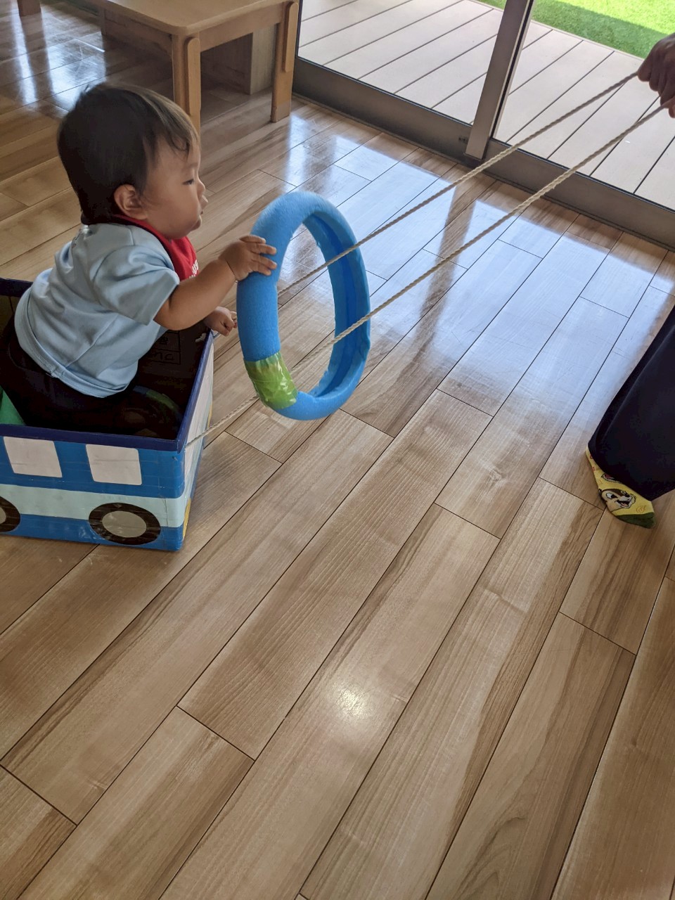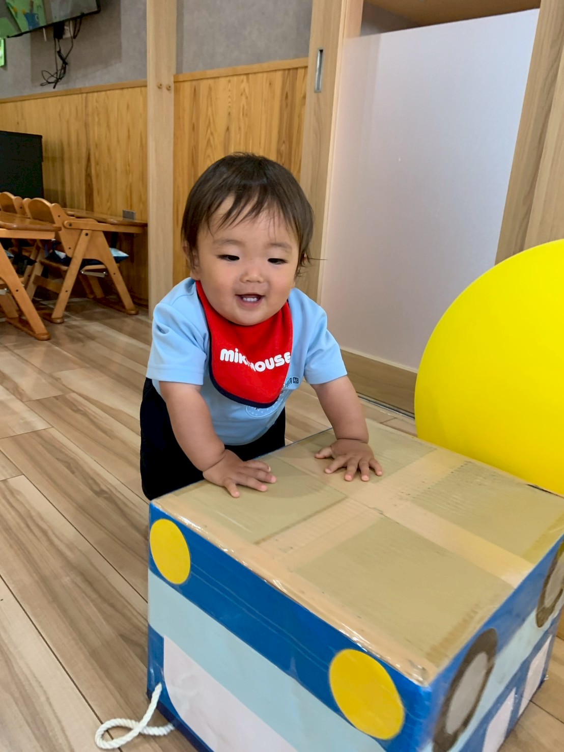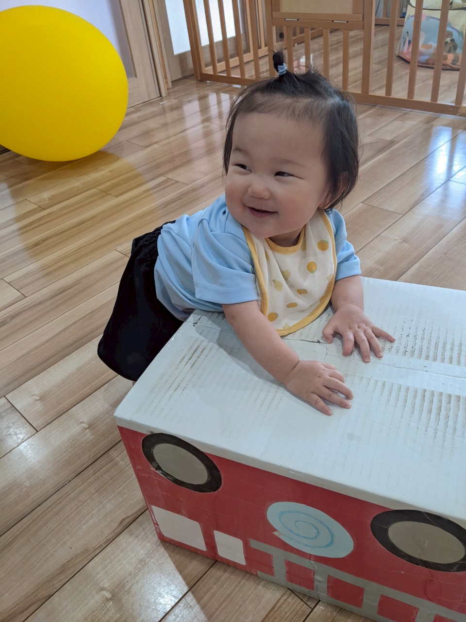 その後はお部屋で段ボールバスに乗ったり、バスを押して歩く練習をしたり、大きな風船を追いかけて身体をしっかり動かして遊びましたよ🚌