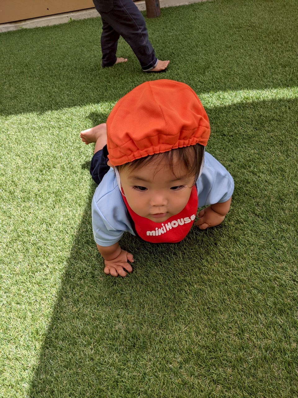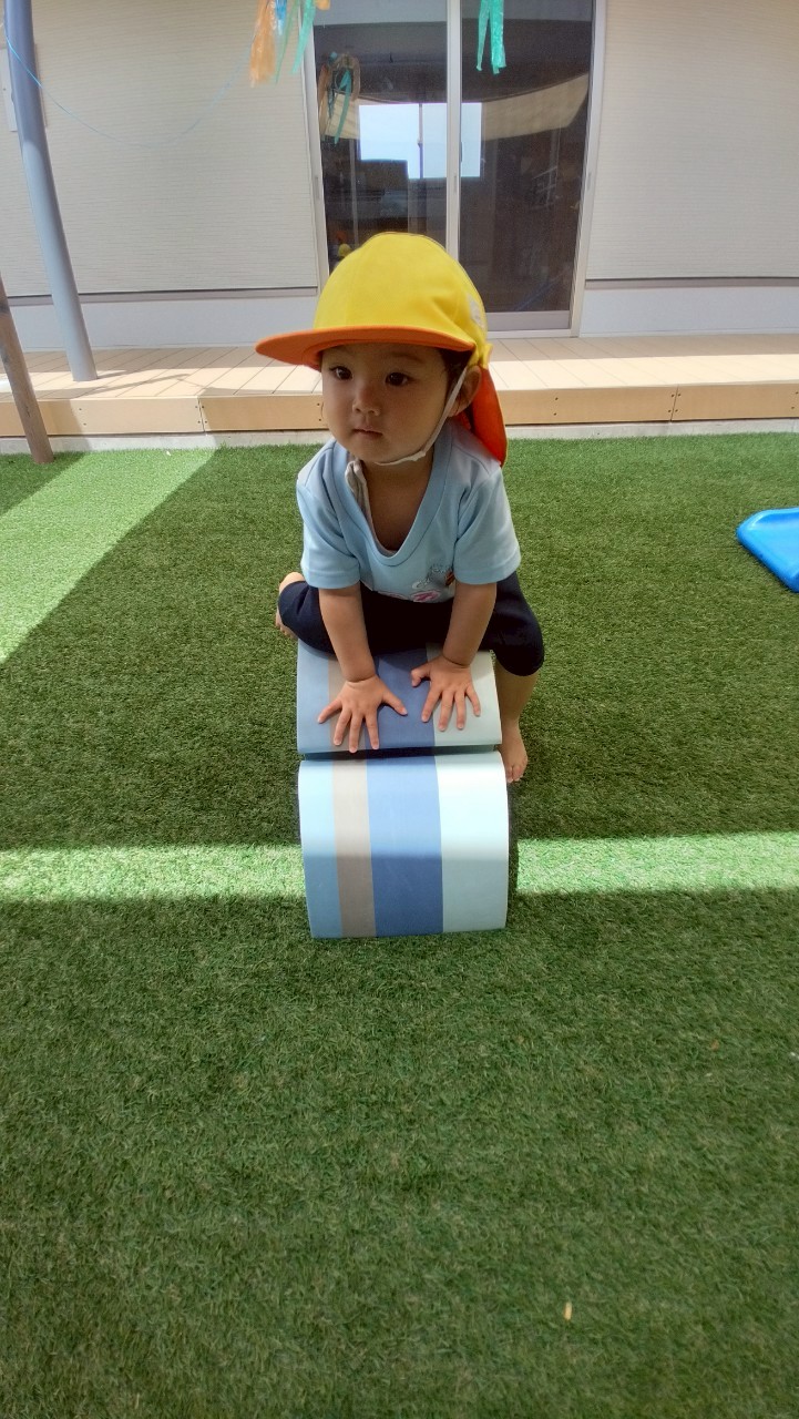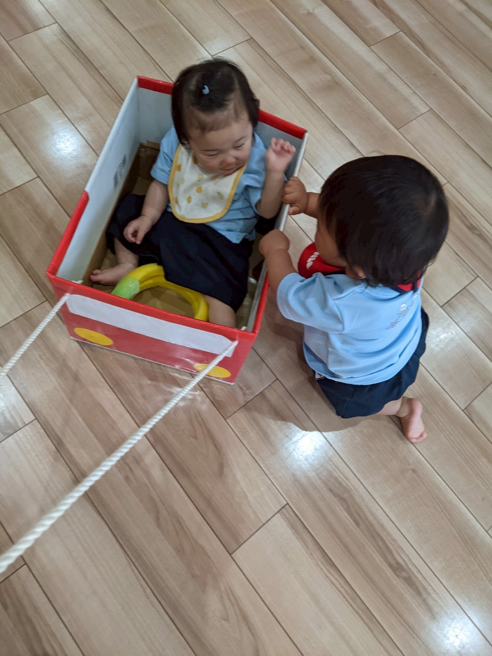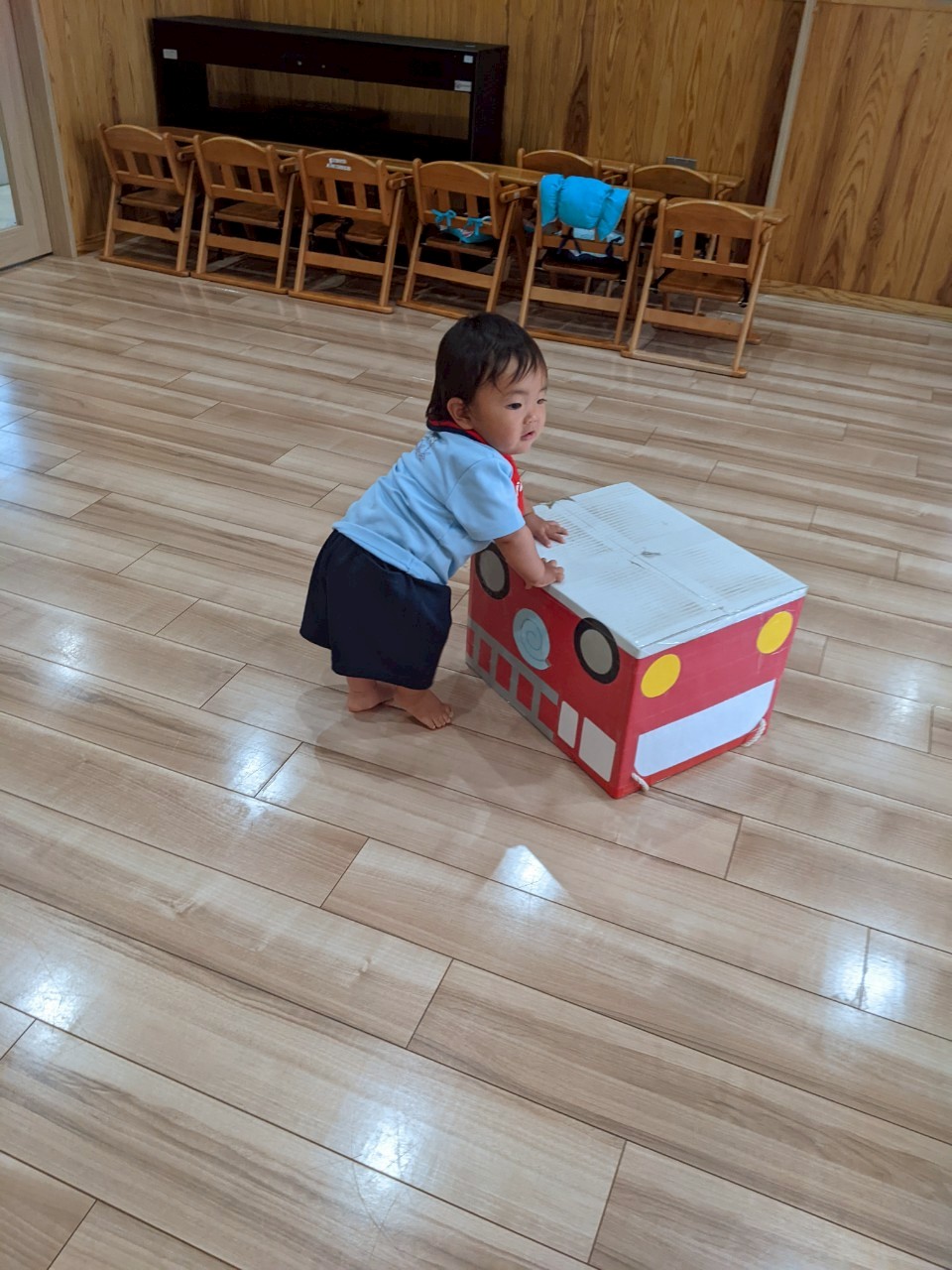 その後はお部屋で段ボールバスに乗ったり、バスを押して歩く練習をしたり、大きな風船を追いかけて身体をしっかり動かして遊びましたよ🚌