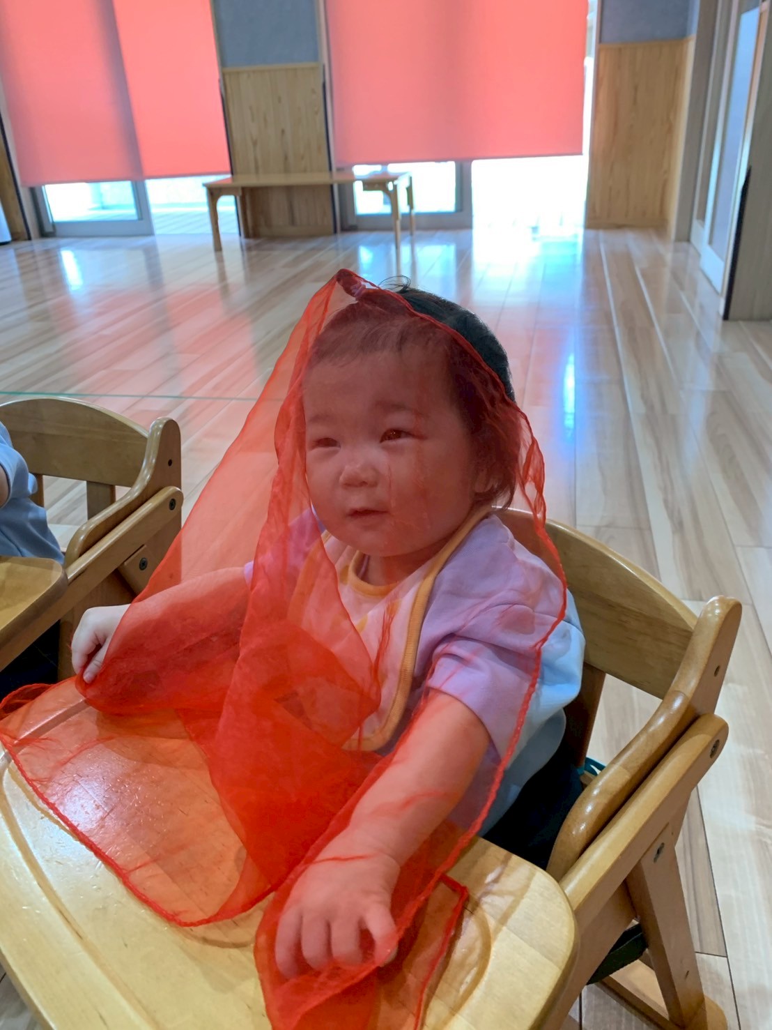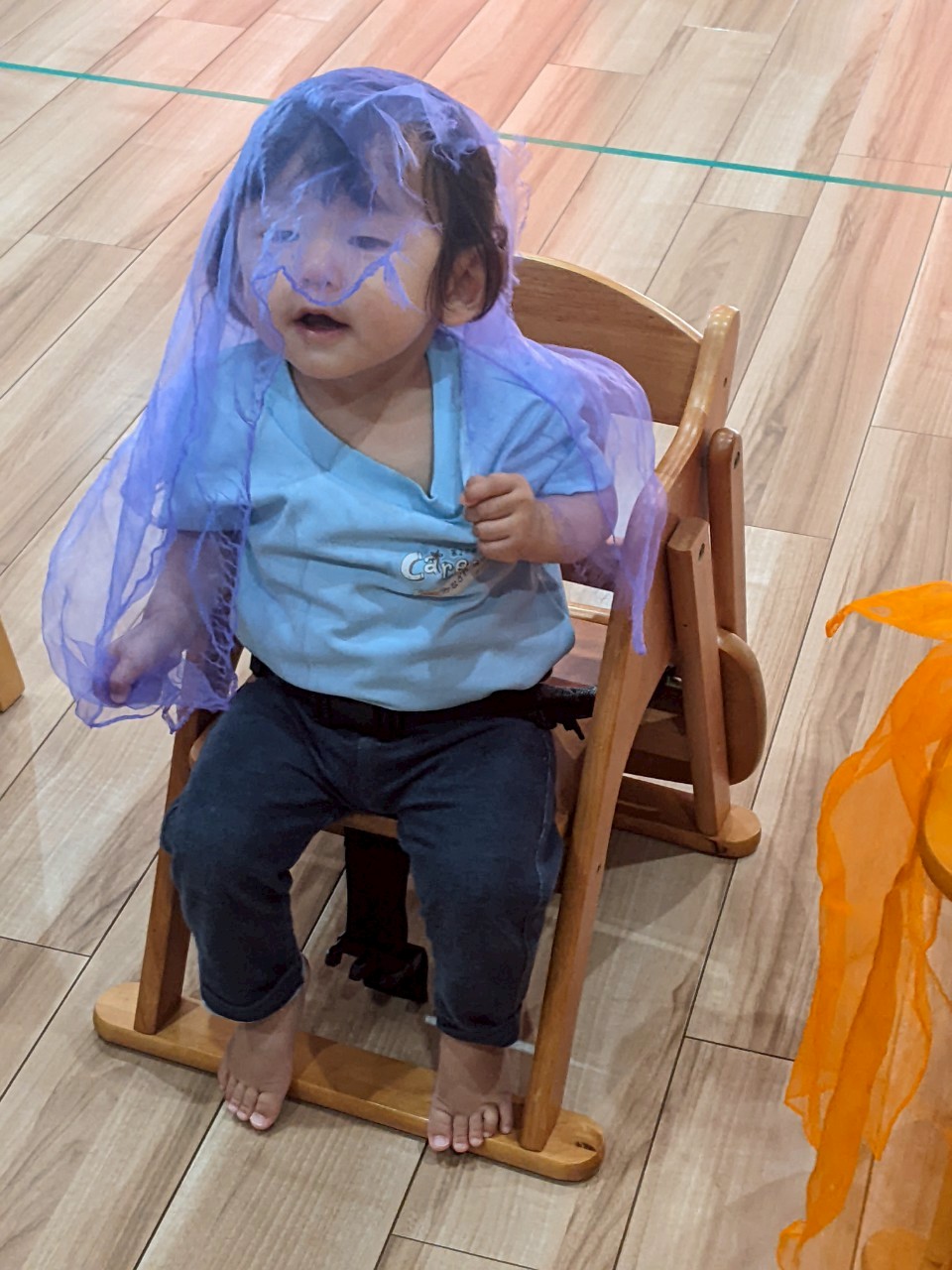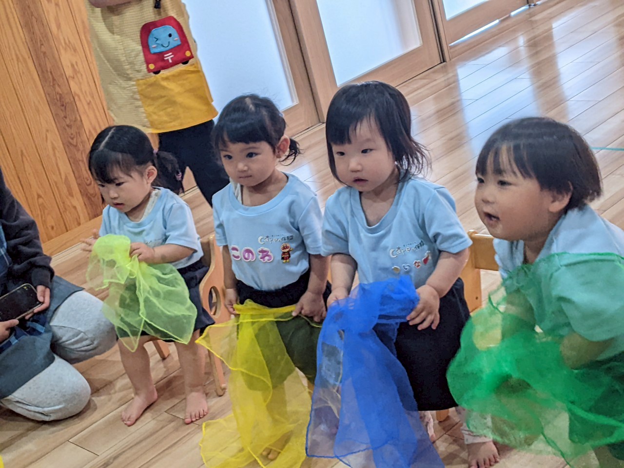 可愛い絵本に興味津々✨それから卵型のマラカスを受け取りしっかり握ってシャカシャカと音を鳴らしたり、好きな色のスカーフを選び音楽に合わせてふわふわと揺らして楽しみました💕