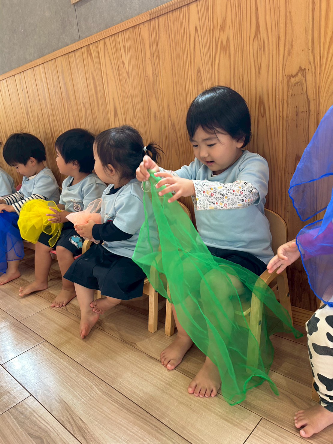 シフォンスカーフでミックスジュース(ジュース)を作ったり好きな色のハンドルをもらって「バスに乗って🎵」を踊って楽しみました💕