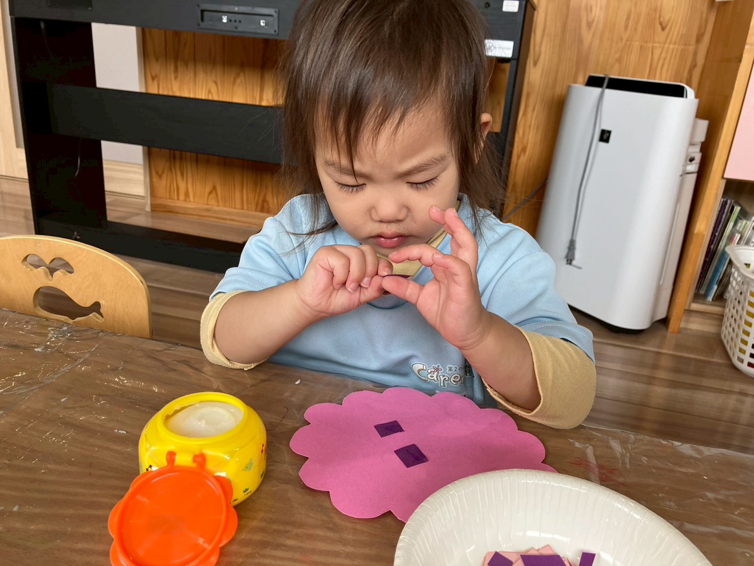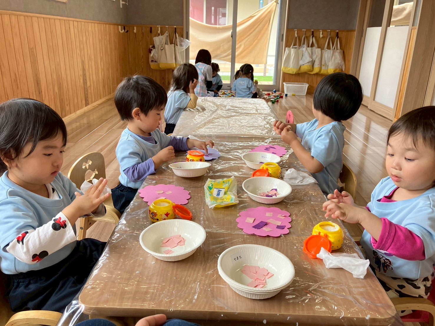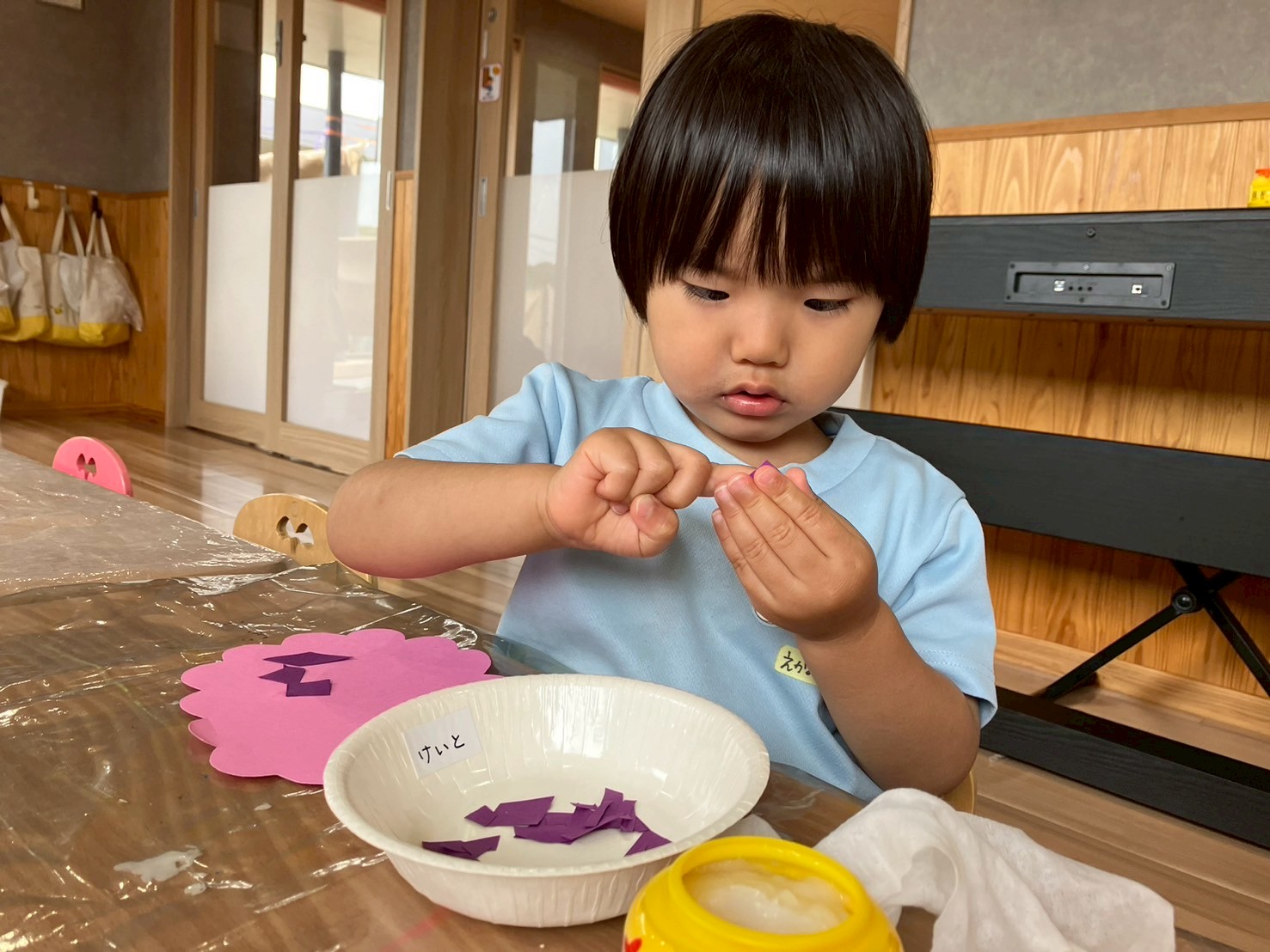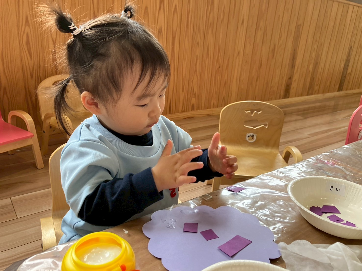 初めての、のりを指で塗る活動にワクワクする子ども達🥰