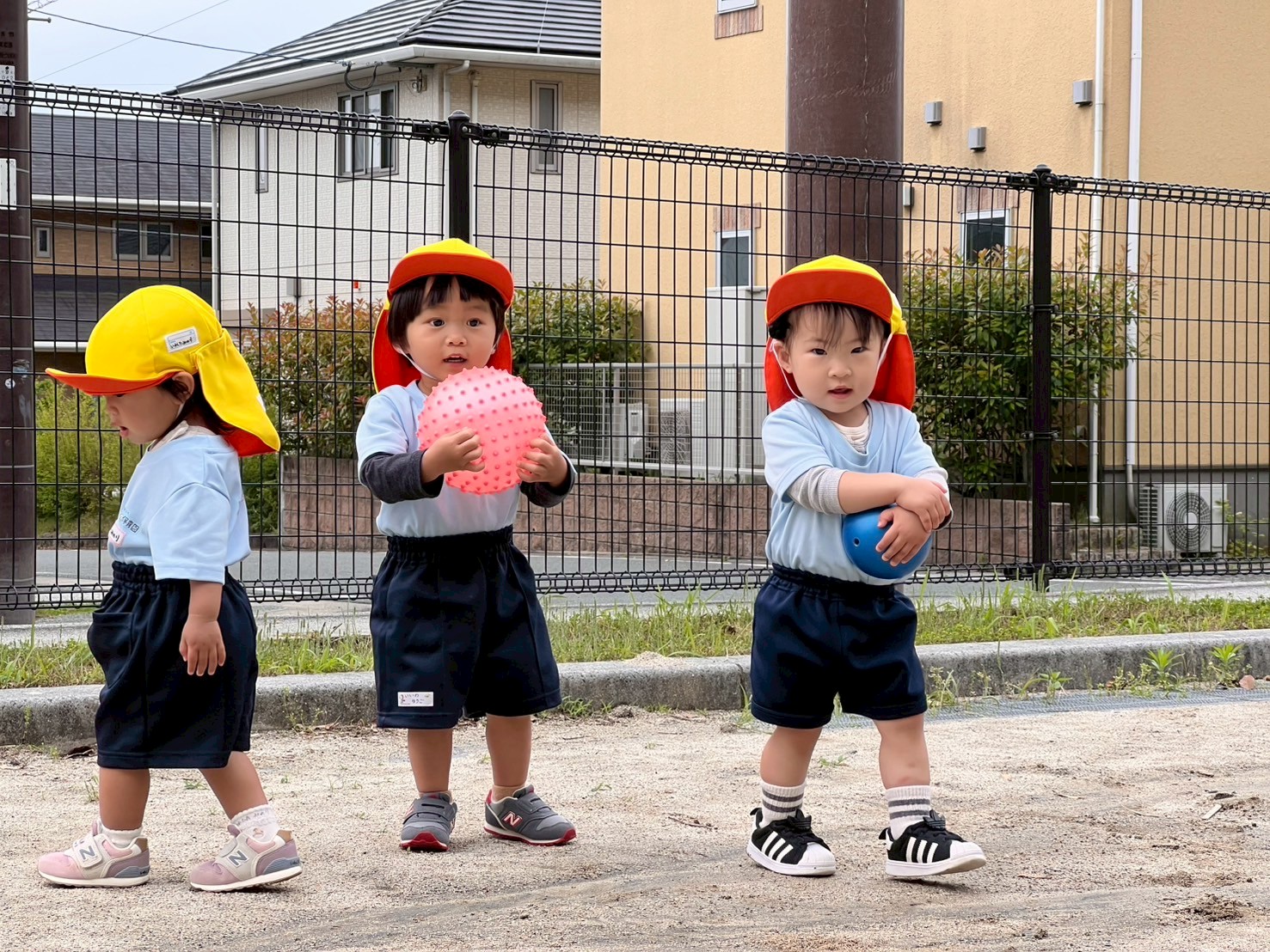 その後はりす組さん🐿️と一緒にくりえいと北公園にお散歩に行きました😄おんぶのお友だちとカートに乗るお友だち。周りの景色を楽しみながらお散歩しました❣️歩くのが上手になったお友だちは歩きたくてたまらないようで、先生と手を繋いで頑張って歩きましたよ😁曇り空でしたが、気持ちの良いお散歩になりました💕