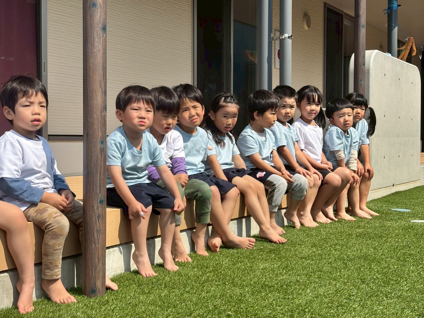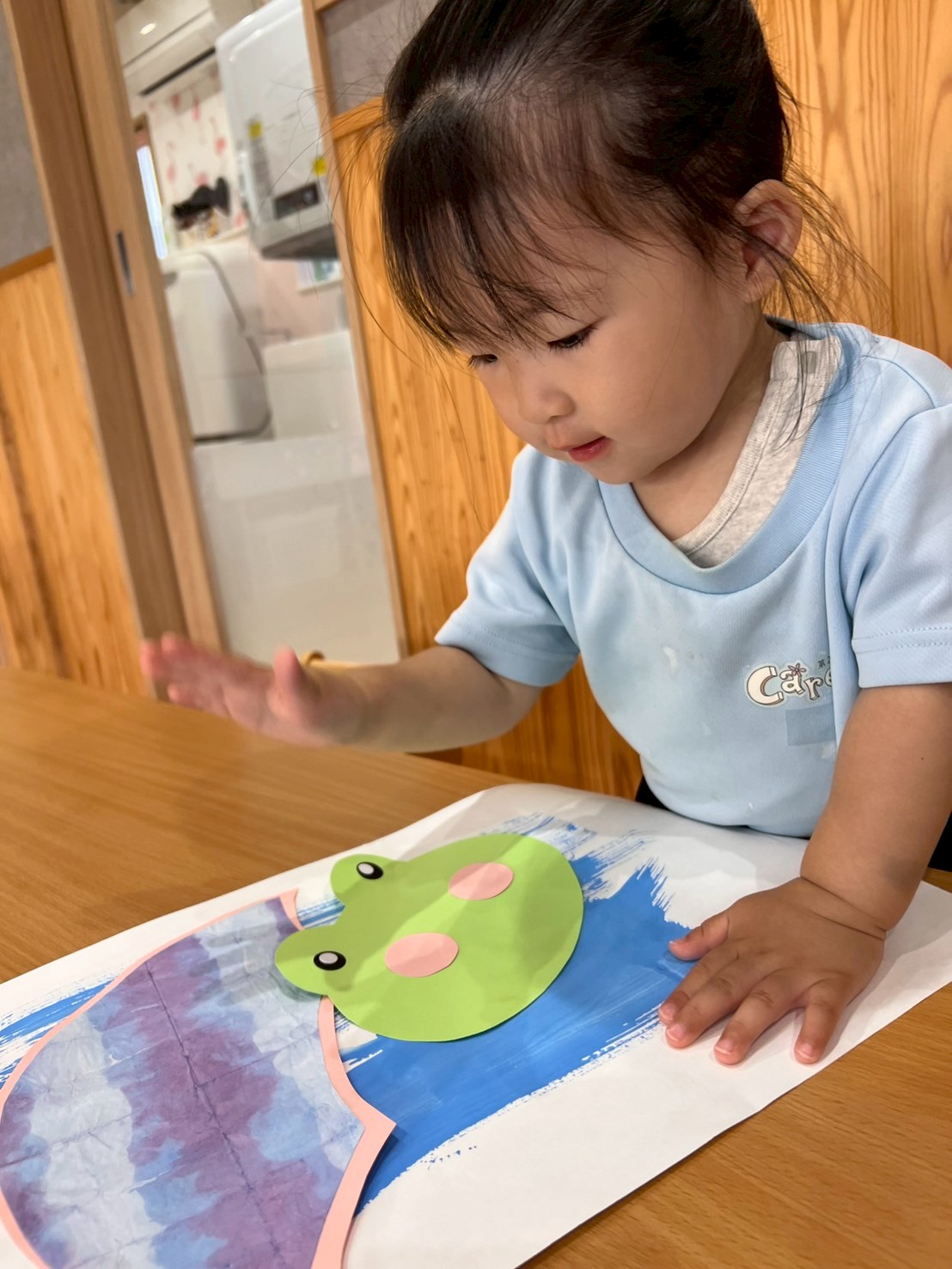 そして椅子に座ってシール貼りをしました❣️まだまだ指先でつまんでシールを剥がしたりシールを貼る動作は難しいですが、先生と「ぺったん!」と言いながら集中して頑張っていました😄指に付いたシールが取れずに、手をバタバタ振るお友だちもいて可愛かったですよ🥰