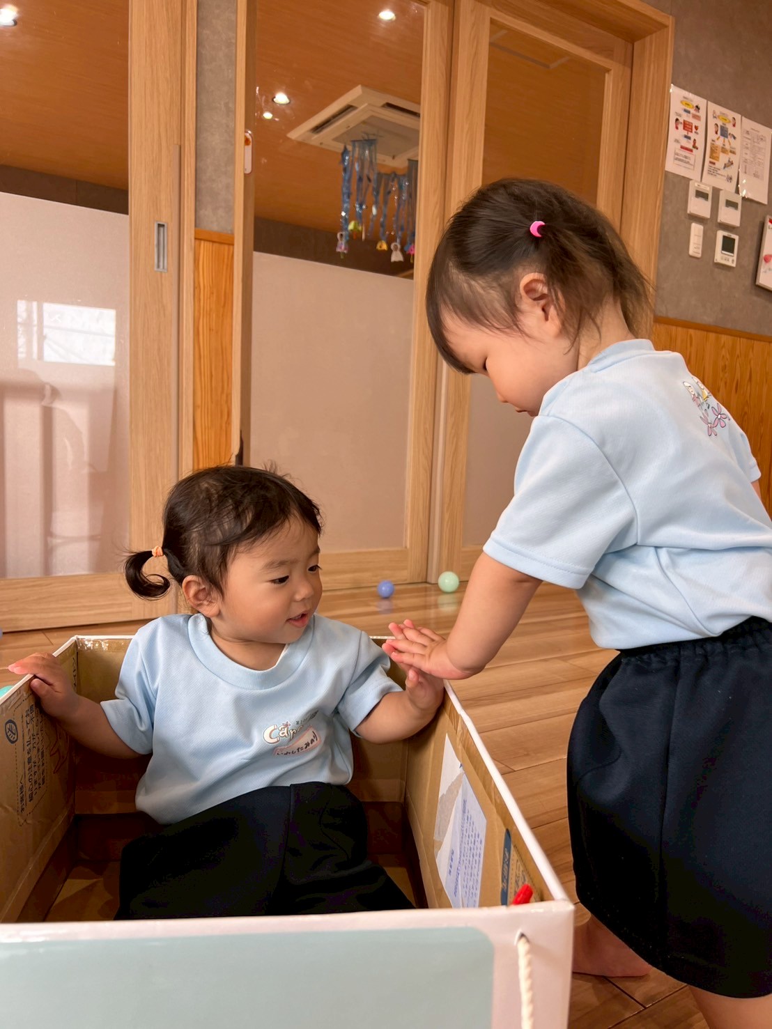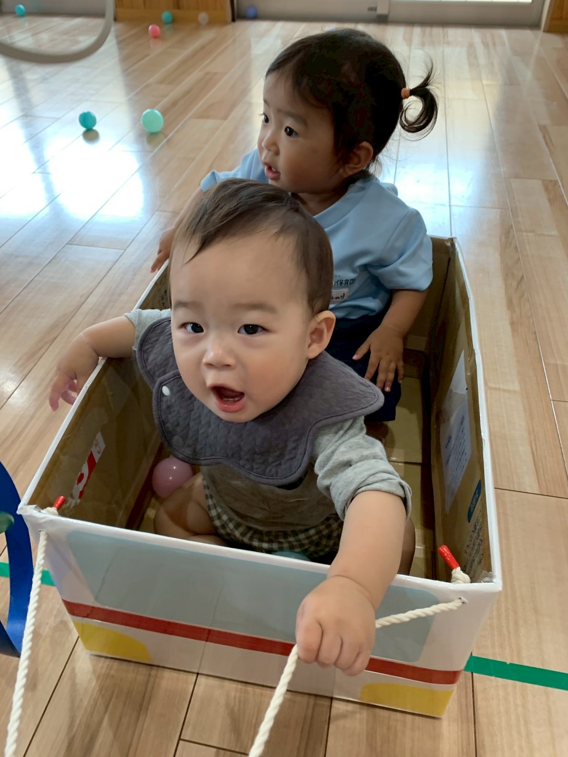 それから、運動会の練習でハイハイレースをしたり、りす組さん🐿️と段ボールバスに乗ったり、ボールプールで一緒に遊びました💕りす🐿゙