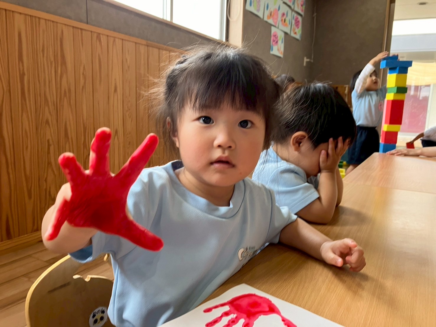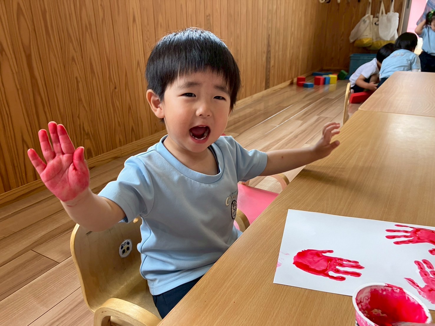 筆を使って手に絵の具を塗ると「こしょばい😆」と言っていたりニヤニヤと笑う子ども達の姿がありましたよ😂