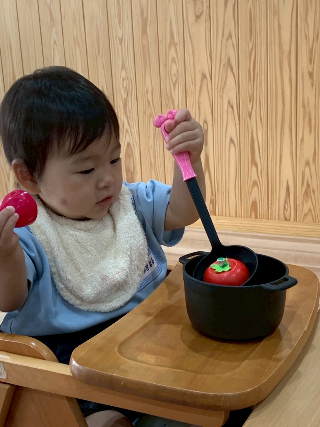 その後はお椅子に座ったままおままごと遊びをしました🍩お鍋にお玉でまぜませ❣️可愛いコックさんになっていました✨
