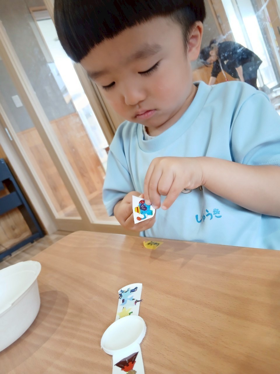 スポンジで絵の具をポンポンとスタンプのようにのせたり、小さなシールをペタペタ貼ったり…指先をしっかり使って、みんなとっても集中していました✨